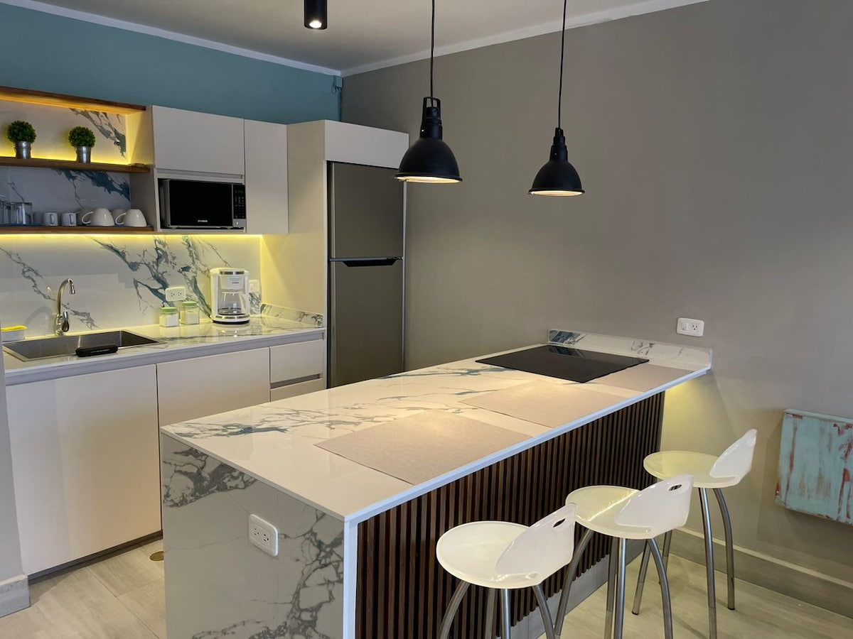 Nuevo y totalmente equipado apto con una cama king. Cerca de la playa y centros comerciales, restaurantes, casinos, farmacias y supermercados. Perfecto para quienes buscan recargar energías después de explorar los tesoros de Mgta, pero también para los viajeros de negocios que buscan un buen descanso nocturno. Con bellas áreas sociales, piscina, parque infantil, area de parrillera, vigilancia 24h, y estacionamiento. Excelente para una experiencia única