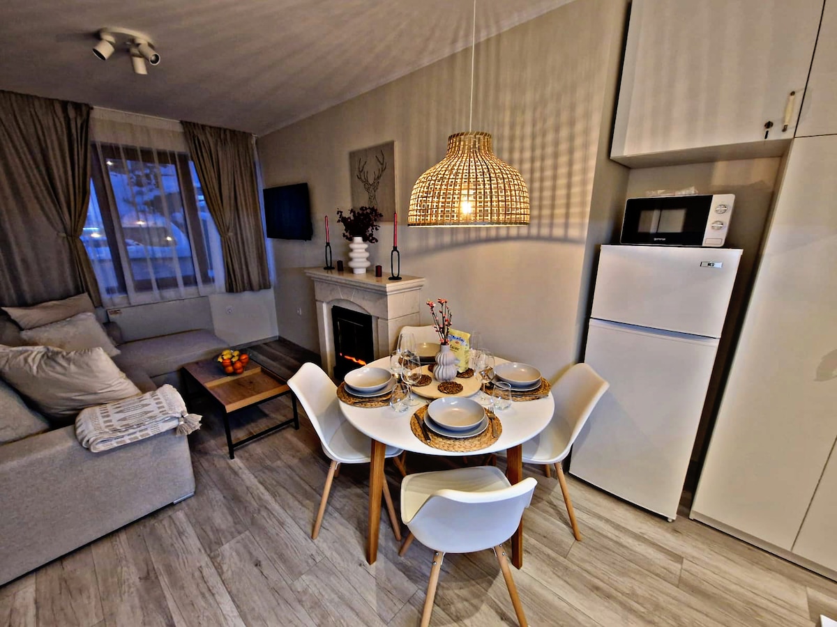 IT'S TIME TO GET COSY with our comfy and quiet 2 bedrooms apartment, SKI-TO- THE DOOR - 50m away from the ski lift Studenetz! You can enjoy winter next to the fireplace. Access to a full equipped kitchen and a balcony with a splendid mountain view. Couples, solo adventurers, and families are welcome! All in one complex : supermarket Aliaska,SPA center (price liste on the lobby bar), restaurants, lobby bar, tavern and bowling. Wish you an excellent stay in Rhodope Mountains!