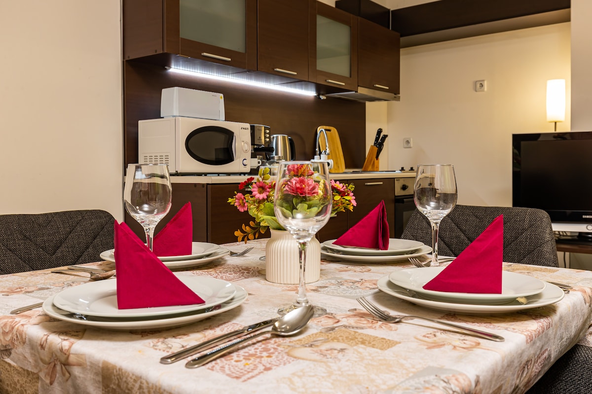 IT'S TIME TO GET COSY with our comfy and quiet 2 bedrooms apartment, SKI-TO- THE DOOR - 50m away from the ski lift Studenetz! You can enjoy winter next to the fireplace. Access to a full equipped kitchen and a balcony with a splendid mountain view. Couples, solo adventurers, and families are welcome! All in one complex : supermarket Aliaska,SPA center (price liste on the lobby bar), restaurants, lobby bar, tavern and bowling. Wish you an excellent stay in Rhodope Mountains!