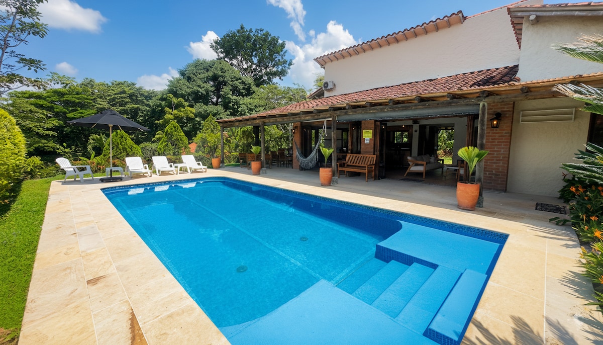 Villa Kiara is the perfect home for relaxation and enjoyment. Located within the exclusive Fincas Panaca condominium, next to Panaca Park, 7 km from Quimbaya, and 20 km from the National Coffee Park. It boasts a perfect climate, a private pool with a natural view, and is close to all the tourist attractions in the beautiful coffee region. This home is ideal for families or groups of friends. It also features 24-hour Starlink internet, Direct TV, and private parking on site.