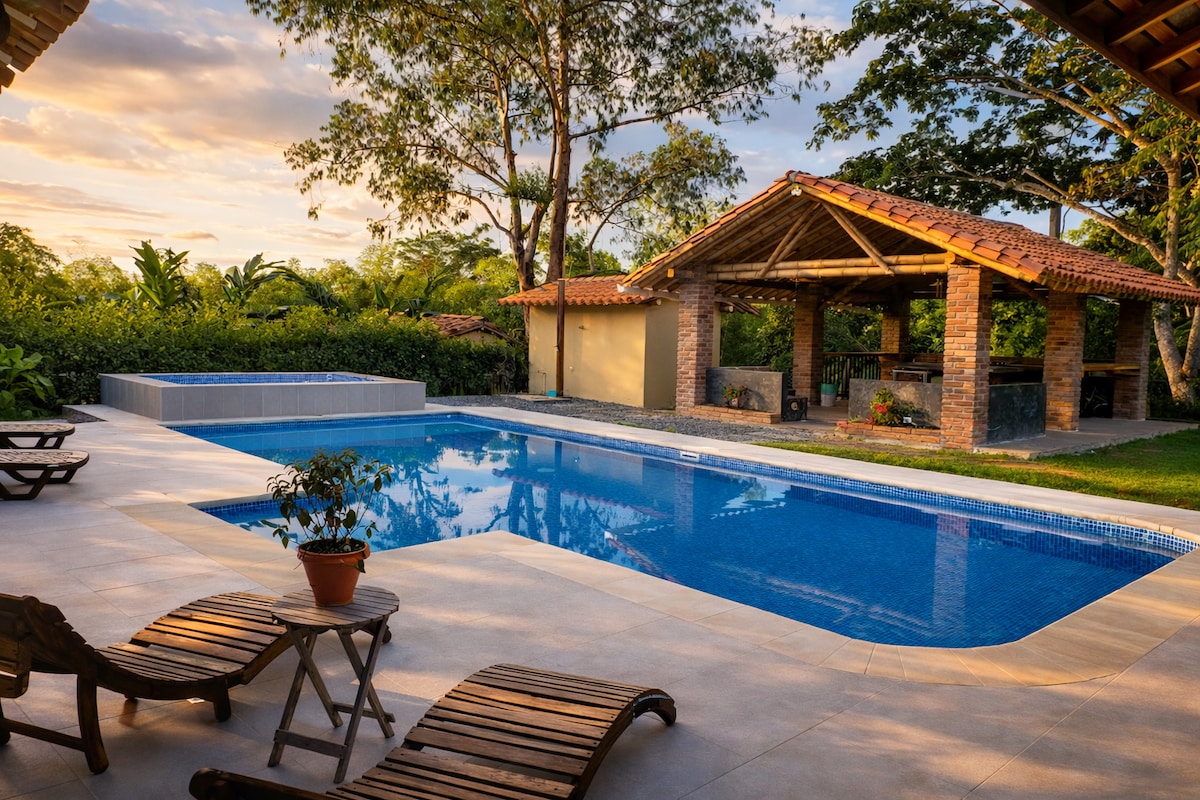 Country House in Pereira, Sector Cerritos, Easy Access. You will enjoy sunny days, tranquility, connection with Nature, and beautiful sunsets. Overlooking a spectacular guadual. Located 15 minutes from the International Matecaña Airport, with an excellent location to places of interest in the Coffee Region; 5 minutes from the best food malls in the city, supermarkets. Perfect place to enjoy with the family. With heated Jacuzzi, BBQ area, wood oven for pizza. Campfire area. Pet Friendly.