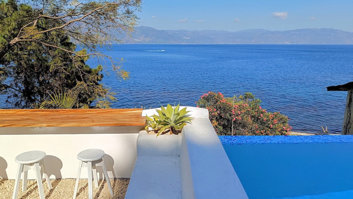 Modern meets Maya, this lakefront house, 10 min boat ride from Panajachel, is a unique place. Two bedrooms with sliding doors to balconies overlooking the lake and surrounding mountains. Loft type downstairs with living/dining room and kitchen for sharing quality time together while gazing over the lake. Walking distance to restaurants for candle-light dinners, kayak/sub rentals and hikes along mountain footpaths or the lakeshore. Private yet safe and accessible. Be prepared for a lovely stay!