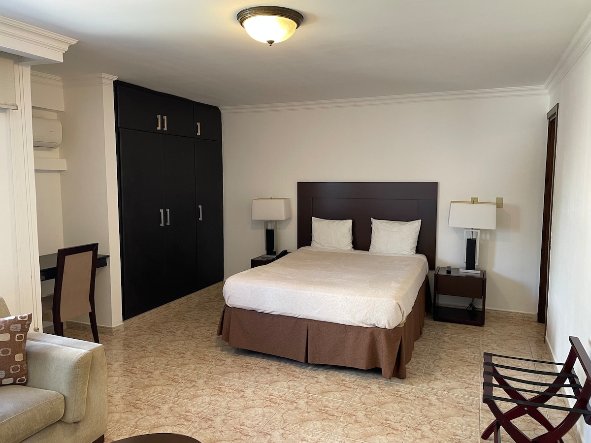 Luxury 70 m2 one bedroom apartment in the HEART OF THE CITY with marble bathroom, hardwood carpentry, top quality materials and finishes. BREAKFAST BUFFET INCLUDED! Fully equipped kitchen. Includes washer and dryer. Incredible views of the city skyline and the Panama Canal. The building has a professional gym, swimming pool, coffee shop with room service, meeting room, security and reception24 hours.