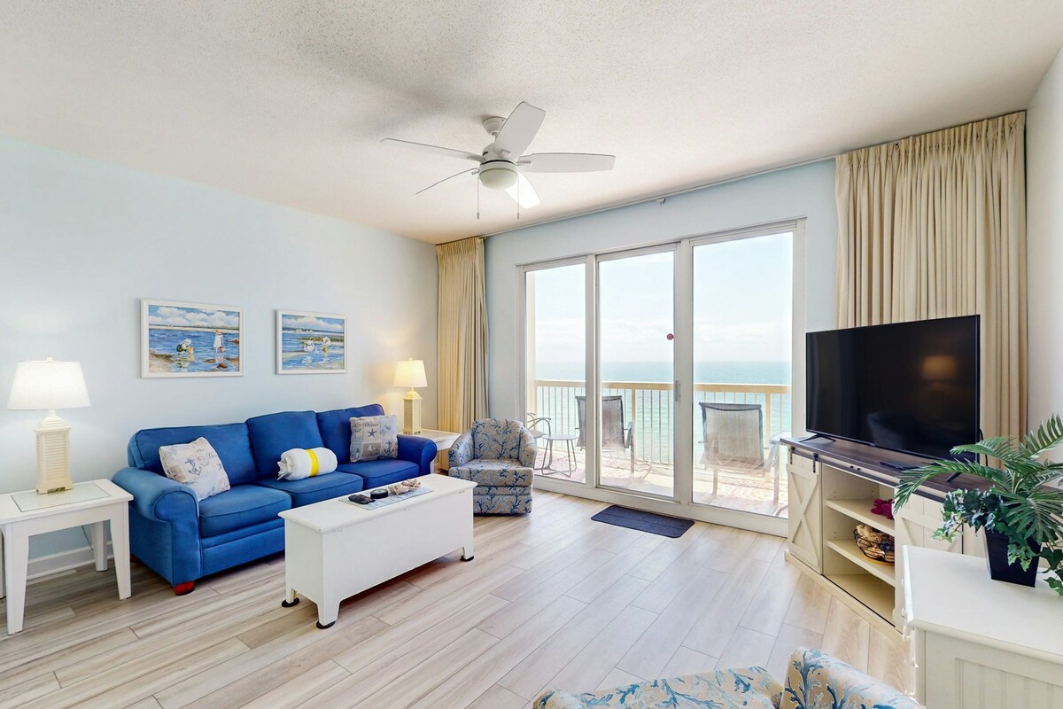 5th-floor condo directly on the world's most beautiful beach. Fully-equipped condo located at Emerald Beach Resort. Located within 1 mile to Pier Park. 1 bedroom/2 bathroom unit, sleeps up to 7. **Note: Must be 25 years of age or older to rent - 5th Floor unit - Large oceanfront balcony - 1 Bedroom / 2 Bath / Bunks / Queen Sofa Sleeper / Single Pullout - 3 outdoor pools & jacuzzi - 2 flat panel LCD TVs / Cable - High speed Wi-fi - Full Kitchen - Linens / Towels provided - Garage parking