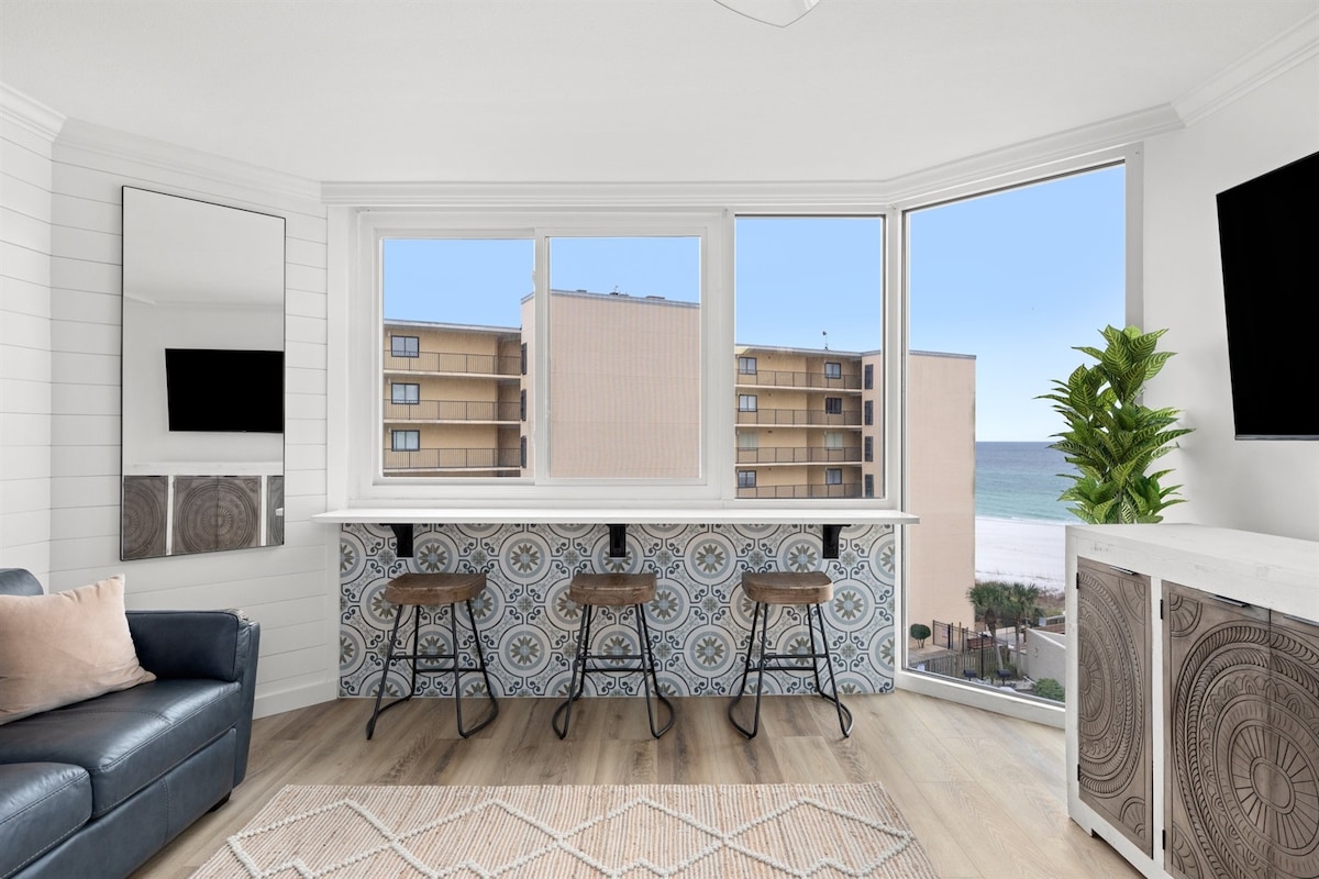 Newly renovated [Sep 2017] modern luxury studio with breath taking gulf views, walking distance to Pier Park and Gulf world and loads of amenities such as heated pool, hot tub, GYM and mini movie theater. This is a studio with a kitchenette that houses a mini fridge, microwave oven, toaster and a mixer if you opt for a home made margarita. Please check out our other 1BR and 2BR listings as well. Building is situated across the street from Sharky's. Property is beach front but not on the beach.