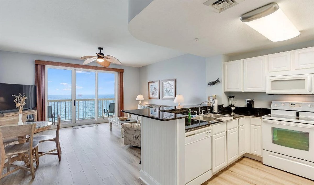 Relax on this units spacious balcony and watch the ocean waves crash underneath the sunset! The one bedroom unit offers a King bed in the bedroom, Twin bunk beds and Queen sleeper sofa. Full kitchen with essentials, full sized refrigerator and washer and dryer. Fully vacation ready! Located just steps to the World's Most Beautiful Beaches with a private beach access. You will also only be a 5 minute walk to the pier, restaurants, shopping and activities of Pier Park! Read More Here!