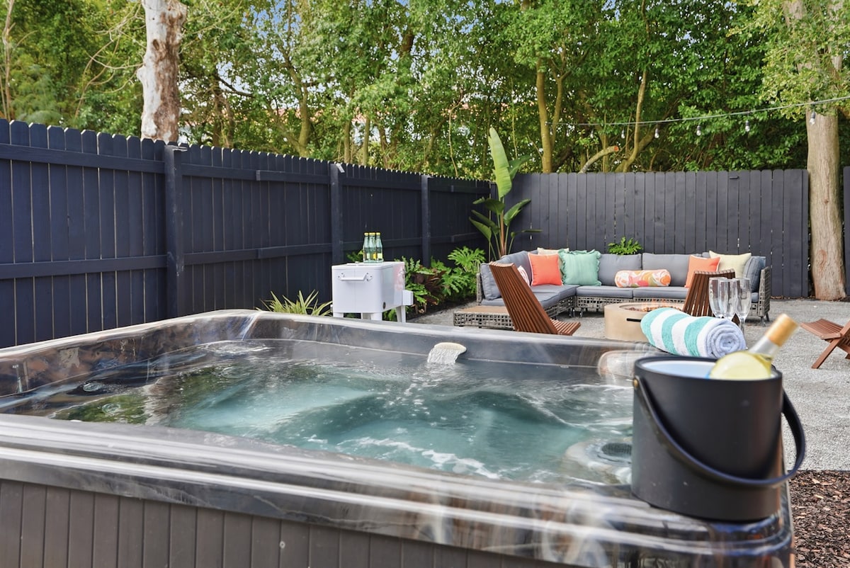 热水泳池+步行2分钟到海滩+热水浴缸+火坑和电影