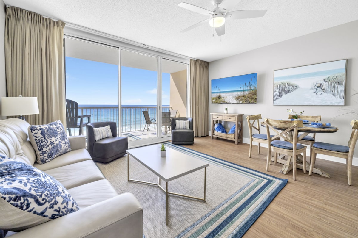 SPECTACULAR GULF-FRONT MASTER ! Amazing Westend Resort and RIGHT ON THE BEACH! Gulf Front Master with 30’ wide 160sqft PRIVATE balcony accessible from master & living area! Streaming 65" 4K TV plus 55” 4k in bdrms, fast Encrypted WiFi , tastefully decorated with “Beachy” feel fresh updates. This comfy getaway has 9’ tall sliders to view the Emerald Coast - pictures can’t do justice. Private bunk room, new sleeper. private beach & every amenity. Walk to Pier Park. Close to airport. It’s perfect!