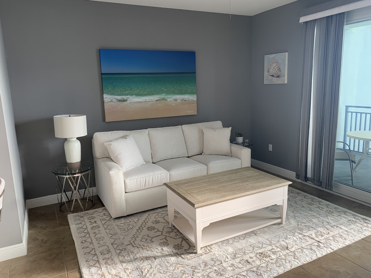 Newly renovated mid-century modern luxury condo with breath taking gulf views, walking distance to Pier Park and Gulf world and loads of amenities such as heated pool, hot tub, GYM and mini movie theater. Please check out our other listings for 2BR and the studio. Building is situated across the street from Sharky's. Property is beach front but not on the beach.