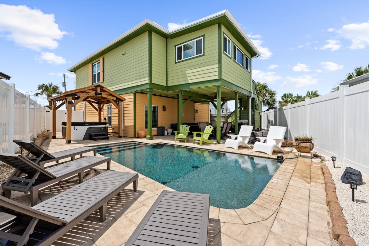 ☀ 5 min easy walk to beach ☀ Walk to restaurants, fast food, stores ☀ Dogs welcome with pet fee ☀ Centrally located and quiet neighborhood ☀ Minutes to Pier Park and and Frank Brown Park ☀ Fenced yard with hot tub, fire pit, picnic area, cornhole Perfect for snowbirds, families, couples or small groups who want plenty to do after spending their day at the beach Sleeps 6: Bedroom 1: King + Twin-Size Trundle Bed (pull out) + En Suite Bath Bedroom 2: Queen Living Room: Twin-Size Pull-Out Chair