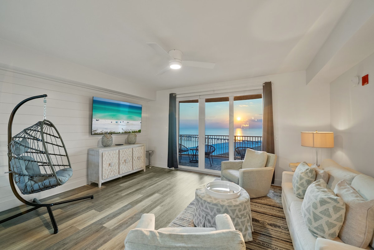 Follow the sun to this beautifully renovated oceanfront studio—where white sand, warm breezes, and crystal blue waters await. • Free beach chairs and umbrella included with your stay (March 15 – October 31). • Relax on your private balcony overlooking one of the most breathtaking beaches in the world. • Centrally located – park your car and forget about it! Walk to top-rated restaurants, Pier Park, and many local favorites.