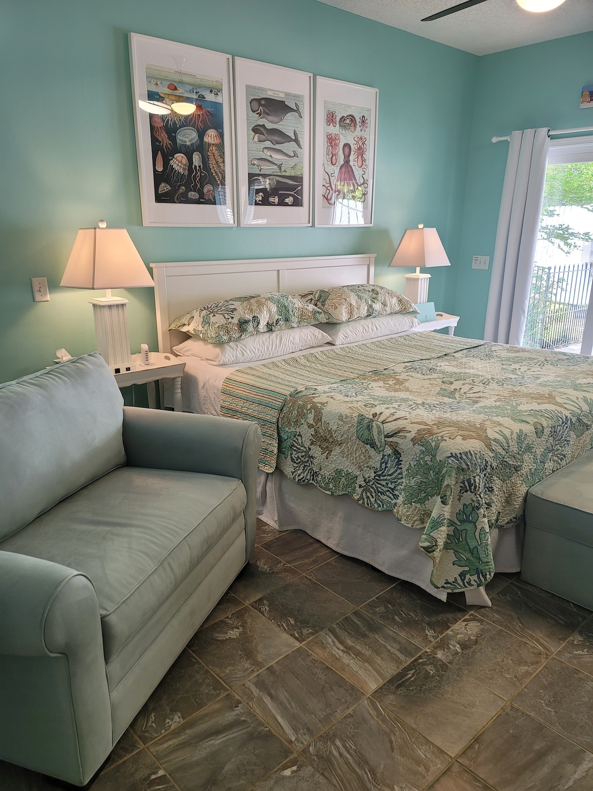 Private patio! Quiet end of PCB! Nice, coastal, ground floor studio featuring kitchen w/ full-sized refrigerator & undercounter ice maker, king-sized bed & twin sleeper chair in the same room (best for child), & private patio just 345 steps to the powdery sand & pristine waters of the Emerald Coast. Sleeps 3 guests max (with added fee). End unit surrounded by trees. Community pool & hot tub. Beach access across the street. Near Pier Park. Complimentary beach chair use.