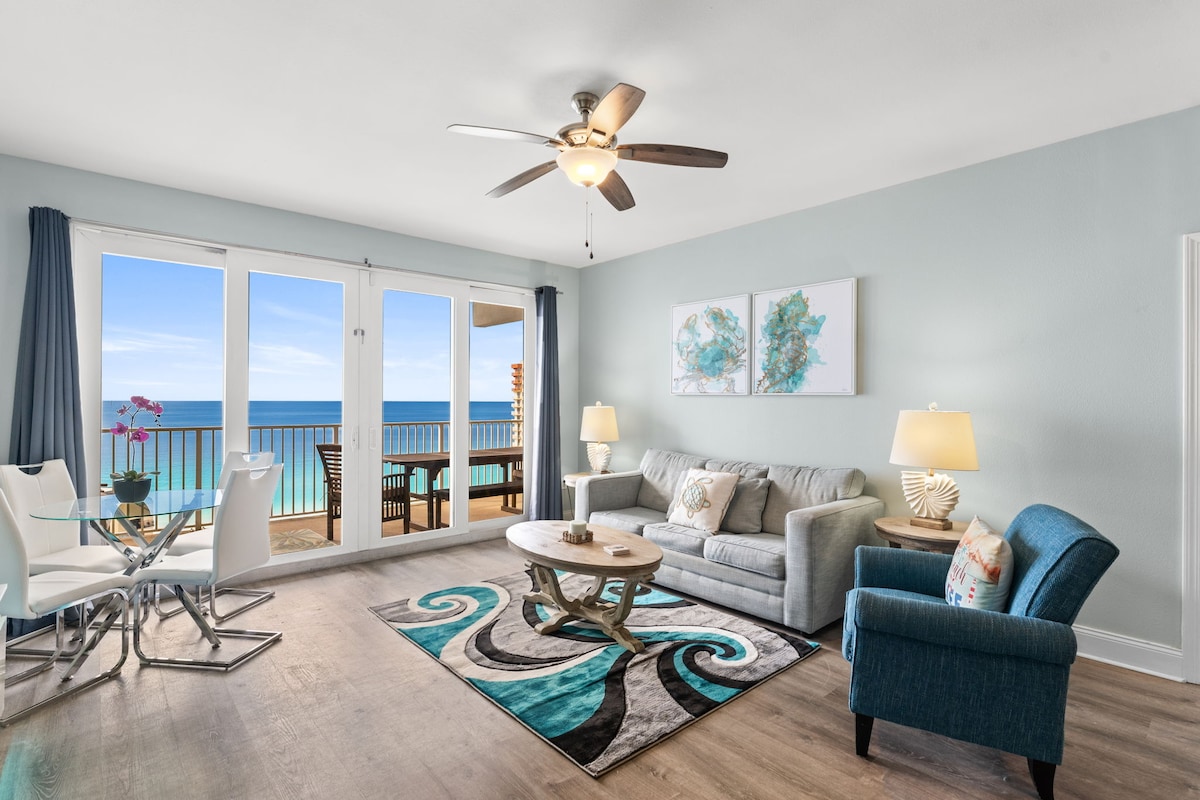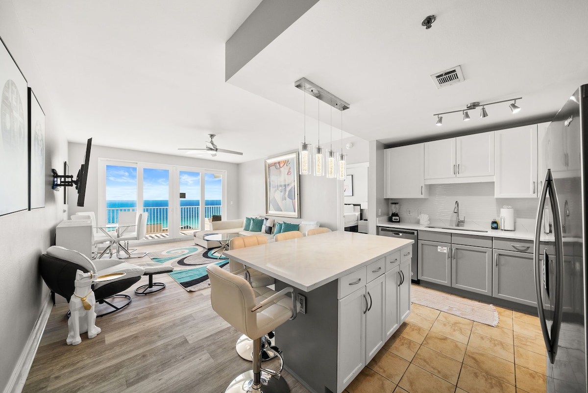 SUNNY 17 is back! 17th Floor overlooks the Gulf! SUPER HOSTED Freshly Decorated this spacious 2bdr/2bath/private bunk room welcomes you in with a big, beautiful VIEWS of the GULF! With Sliders from the Main Bedroom and the LR! The resort is AMAZING with restaurants ,5 Pools (1 heated seasonally)2 oversized hot tubs, 810 Bowling, Private Lake with water shows, 2 story fitness with views of the GULF and more for the entire family to ENJOY! BOOK NOW to get your desired dates!