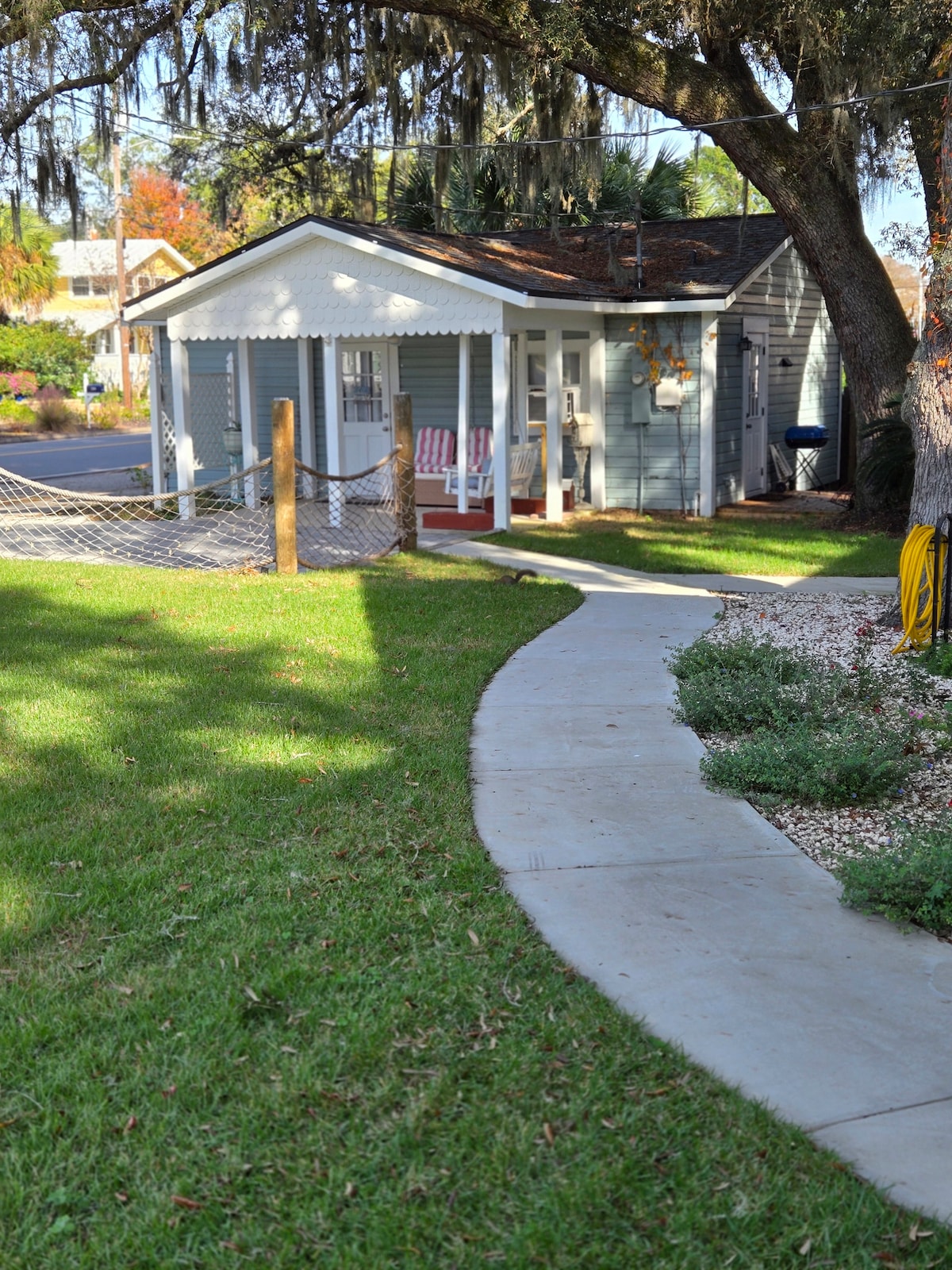 Little Blue cottage on the Bay in Panama City ⛱️. We are located next to the bay and our cozy little town of St Andrews Bay, where locals walk along the pier, shop and window shop in our little town, a peaceful experience after coming back from the busy Gulf side. There is a park to walk your dogs or take the kids. Just a short drive to the Beaches and excitement. Our cottage is a 700 sq ft open plan with a king bed, described as the best sleeping mattress. Hosts are close by to help.