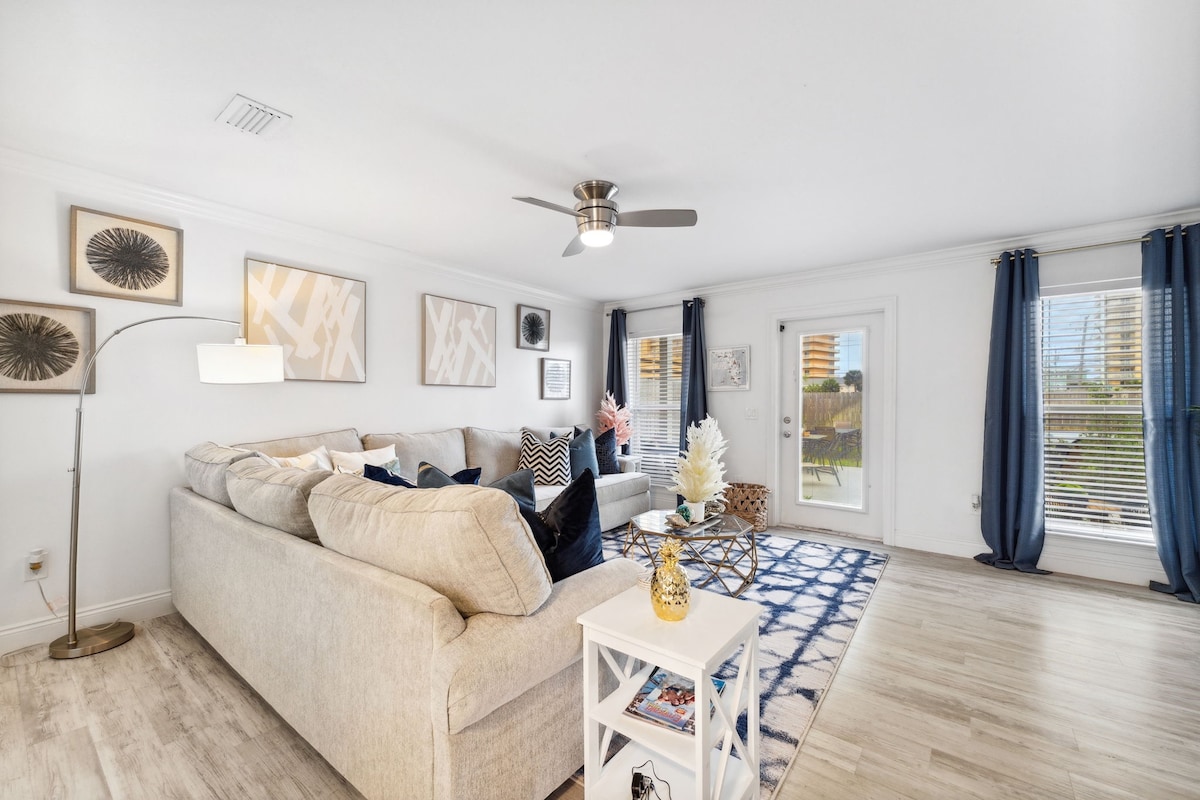 Beach Fun! 7-8 minute walk to beach right in the middle of PCB! Park right in front of townhouse. Hassle free NO elevators or steps to entrance door. Beach side pool with food and drinks. 10 more pools available on resort. Right in the middle of PCB! Short drive to all attractions....Shipwreck Island, Ripley's Believe It or Not, Pier Park, Frank Brown Ball Park, Gulf World, St. Andrews State Park, Shell Island , restaurants and much more! Golf Cart available for rent to use at the resort.
