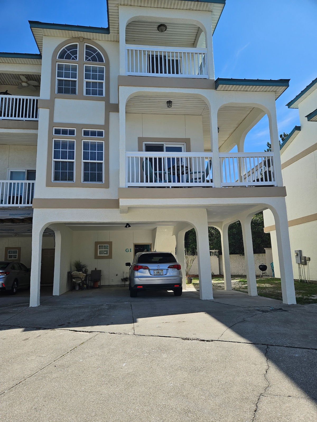 2 Bdrm/1.5 bth townhome, screened outdoor shower, beach gear storage, big living and kitchen, fenced private backyard, covered patio, screened 2nd floor balcony with partial ocean view, entire townhouse provides spacious, private, quite accommodation with stepless access and ample parking a few hundred steps from the Gulf. Walking distance to restaurants and marina for tours and rentals. Well equipped kitchen, up to 6 beds in 3 slipping areas on 2 floors for family gathering inside and outside.