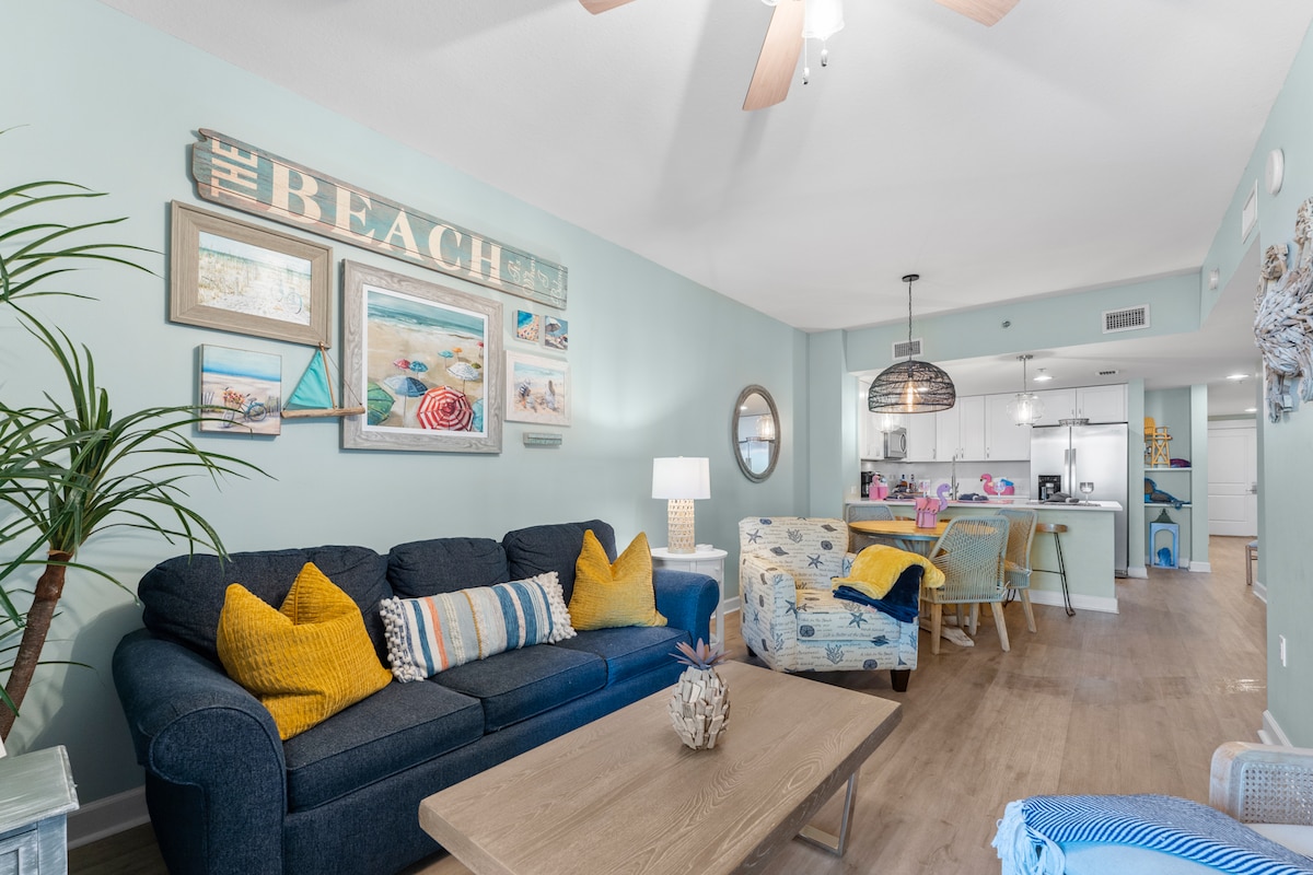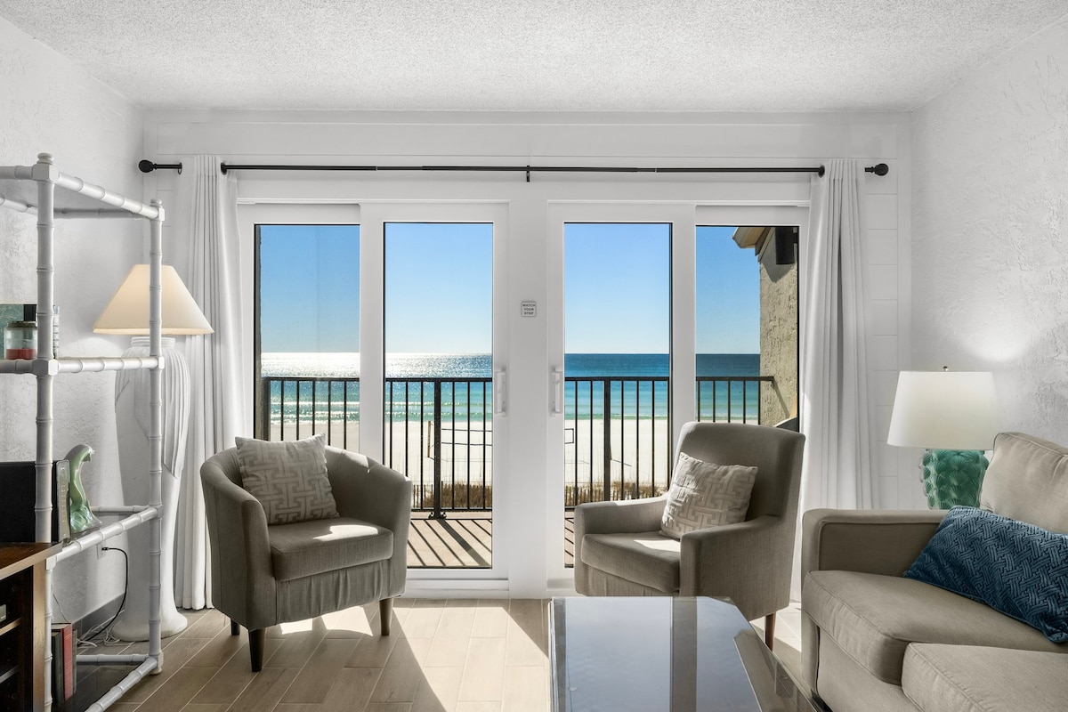 Welcome to your perfect family getaway! Our place is designed for families with young kids in mind. Our second-floor beachfront condo lets you skip long elevator waits. Enjoy the beachfront balcony with access from the master bedroom and living room. The kids will love the ship themed guest room. The complex features a gym, beautiful white beaches, pools, a water playground with a lazy river and splash pads. Alvins island is across the street. 8 Min Drive to Pier Park Book your stay today.