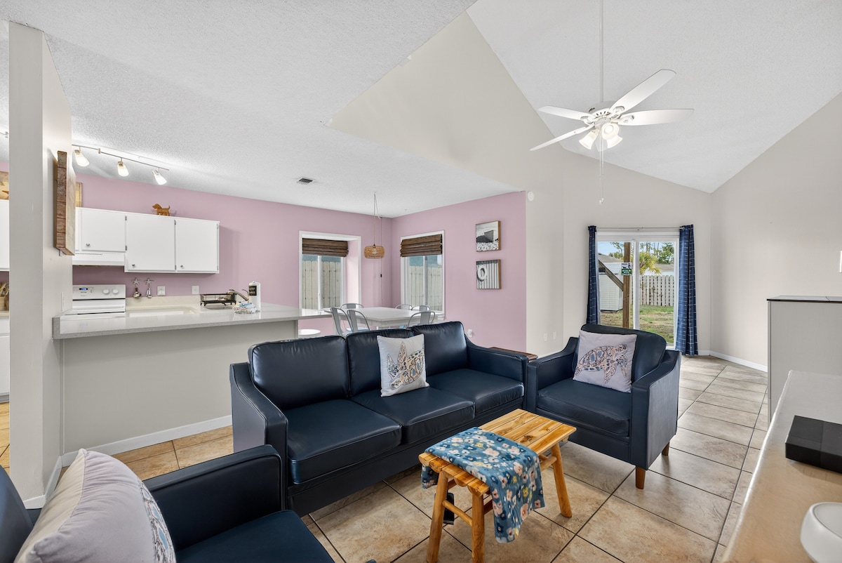 This is a fun, family-friendly coastal escape just one block to the beach. Start the day with a quick walk to the sand, then come home to your private pool, bubbling hot tub, and a stocked game room for late-night tournaments. This comfortable 3 bedroom, 2 bathroom beach home will have you wishing you could stay longer! Fast Wi-Fi, full kitchen, and driveway parking make it easy. Min. age to book: 21. Pet friendly w/ a fee.