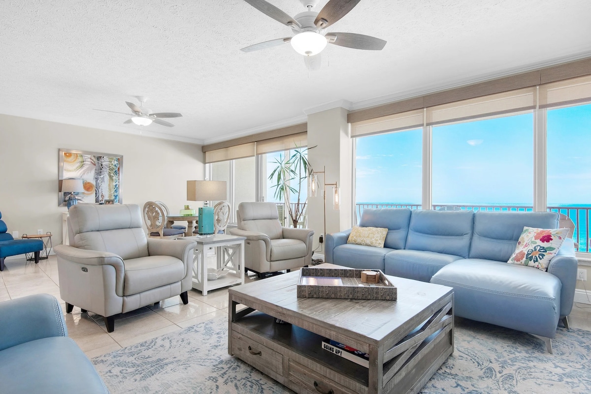 My Happy Place | 2BR+bunkroom/2BA 15th floor condo w/ epic Gulf views! FREE beach setup (2 chairs+1 umbrella, Mar–Oct 2025) plus access to 8+ extra chairs, 3+ umbrellas, toys, books & games. Picture yourself lounging on the balcony, splashing in the pool, or grilling dinner after sunset! Super-fast WiFi, 4 TVs, washer/dryer, well-equipped kitchen, & balcony grill. Resort hot tub, fire pit & good vibes included. $50 Resort Pass (0–1 car/stay), $100 for 2. Weekends book fast—weekday rates shine!