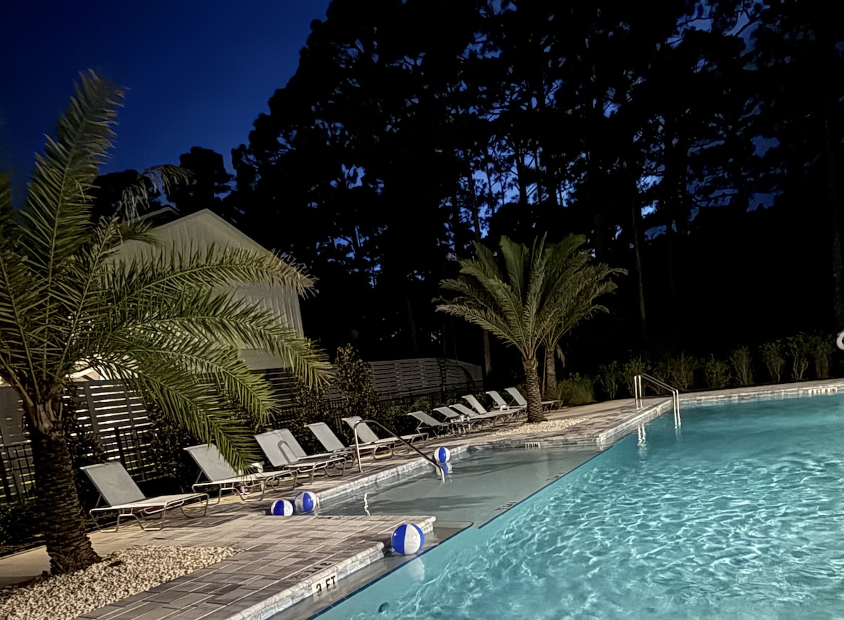 Palms by the Beach has a luxurious homey feel with pool, outdoor shower, private yard, 7 mins walk/3 mins drive to the beach. Great for a family or friends getaway! Perfect location! Less than 10 mins drive to Pier park, 8 minutes to Rosemary Beach & 30A. Destin is a short drive too! Feel at home with a fully stocked kitchen. Comfortable bedrooms and outdoor space with dining and grill area. 2 Adult Tricycles and 3 Kid scooters included! 4-seater Golf Cart available for rent $85 a day!