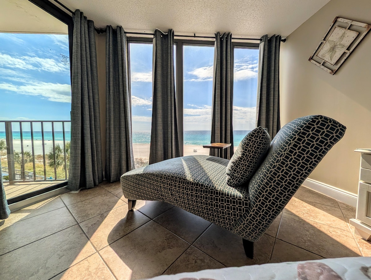 FREE BEACH CHAIRS/ UMBRELLA INCLUDED MARCH through OCTOBER!!! This beach front 1 bedroom 2 bath condo is beautifully remodeled with plenty of space for couples & small families wanting some relaxation and FUN in the SUN IN PCB, FL! Enjoy the private Gulf front balcony, where breathtaking views of the beach and Gulf are on full display! Look out over the seasonally heated East side pool straight to the sugar white sand and turquoise water!