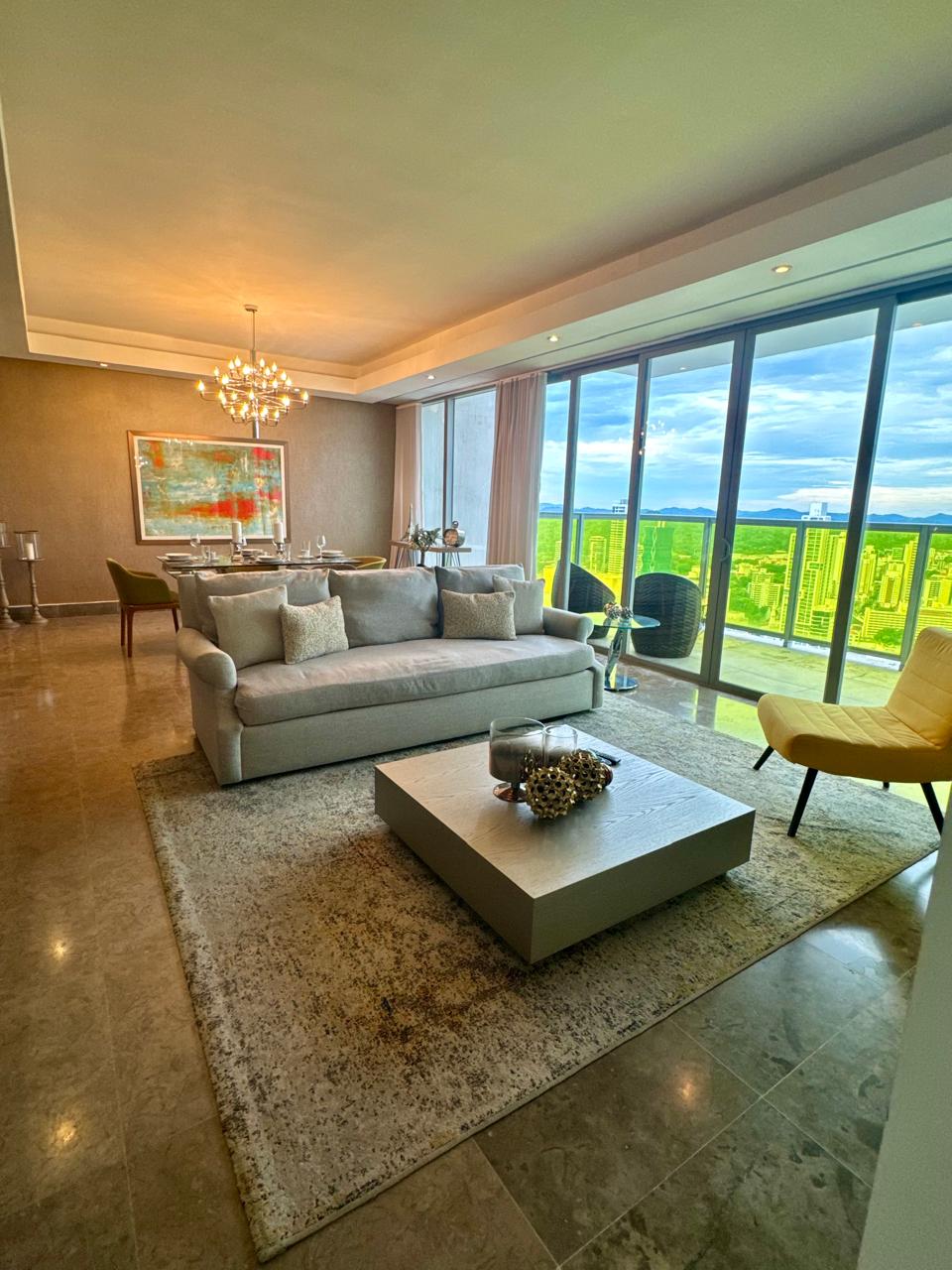 Hermoso departamento ubicado en el piso 54 del más lujoso edificio de Panama. Areas diseñadas por el Diseñador Philip Stark. Tiene 134 metros, está completamente amoblado, cuenta con un dormitorio, walking closet, un baño completo, sala comedor y cocina abiertos, medio baño social, terraza, cuarto de lavado. El edificio es un lugar único, con áreas comunales especiales y lujosas; 2 elegantes restaurantes; 2 piscinas; Gym; SPA; 2 canchas de squash; salsa de póker, lobby con mesa de billa, etc.