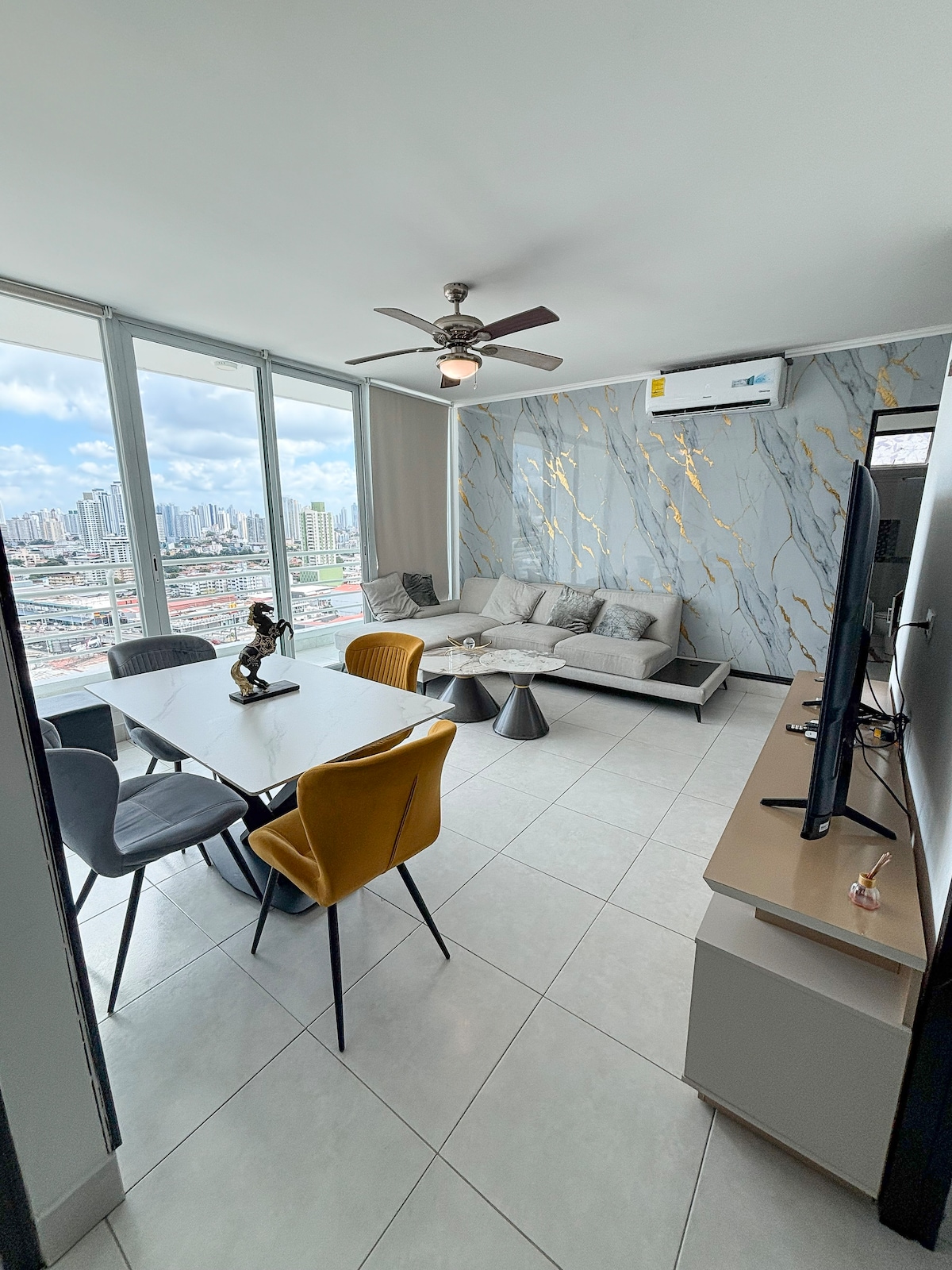 Apartamento entero con ubicación privilegiada en piso alto, con seguridad de ingreso 24 horas y 1 parking gratis. Posee una terraza ideal para deleitarse con las vistas de la ciudad moderna, cinta costera y casco viejo. Consta de dos cuartos, dos baños, sala, terraza, cocina equipada, lavadora/secadora, WiFi rápido. Ubicado a: 5 min de Cinta Costera 10 min de Casco Viejo 3 min Calle 50 y Área Bancaria 7 min Malls 2 min Supermercados y Estación de Metro 4 min Hospitales 4 min Corredor Norte