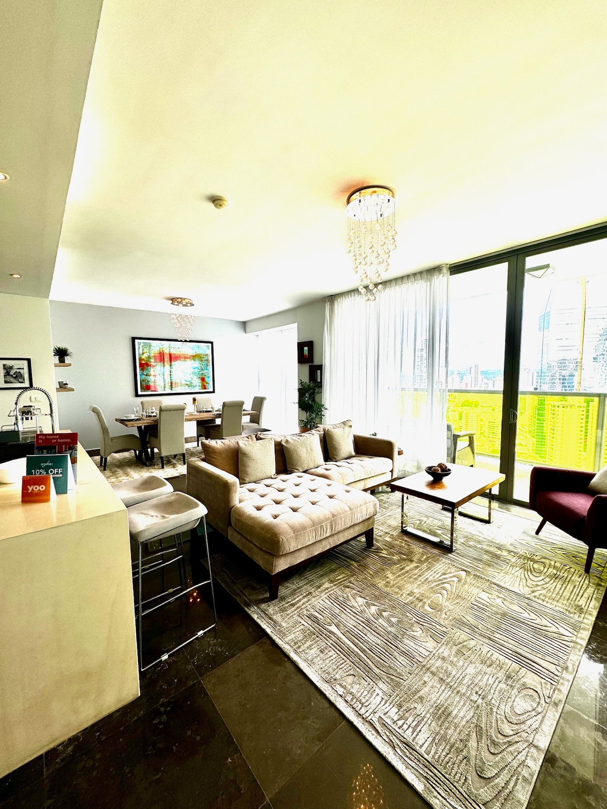 Este lugar tiene una ubicación estratégica: ¡será muy fácil planear tu visita! Ph Yoo and Arts, ubicado en Av. Balboa, súper céntrico Esta hermosa y moderna propiedad cuenta con un estilo único y una vista al mar increíble, piso alto, 2 habitaciones, 2.5 baños completos, Lavanderia, amplia terraza, luces dimeables en todo el espacio, sala comedor, sala de películas, espacio de trabajo, 3 smart tvs, 3 aires acondicionados céntrales, cocina full equipada, cristalería moderna.