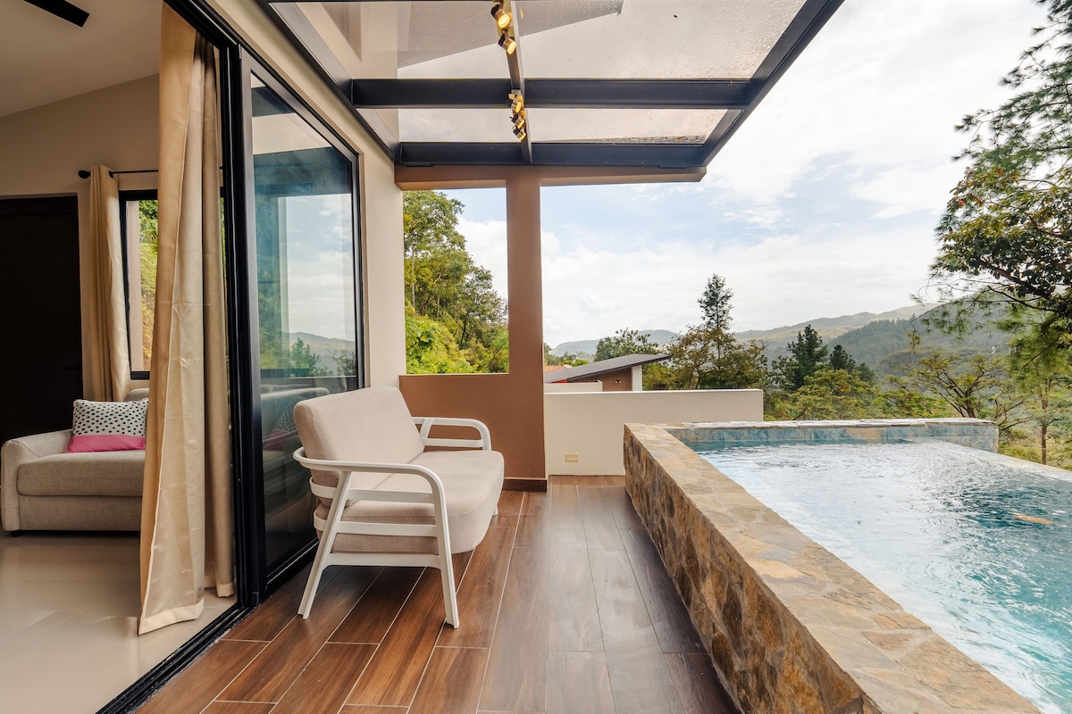 Welcome to the Coffee Cabins. This is one of four stunning A-frame cabins perched on the side of a mountain in the middle of a coffee field. You’re literally surrounded by coffee, both on the trees and in your kitchen with the complimentary coffee grown right here on the farm. Enjoy larger than life views to both the north towards the continental divide and to the west framing Volcan Baru, Panama’s highest peak.