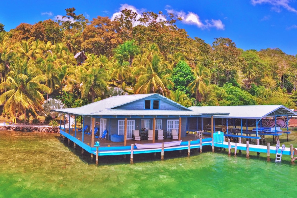 Welcome to our surrealist adventure rereat! Our eco-friendly home boasts being the most artistic and best built in all of Bocas. Enjoy the rare white sand beach, shade from the palms and spectacular coral reef just outside your door. The house is three stories with incredible views of the Zapatillas islands from the front and natural jungle views from the back. The house stays cool + breezy with its open air layout and beach front location. And our boat captain will be available for your use!