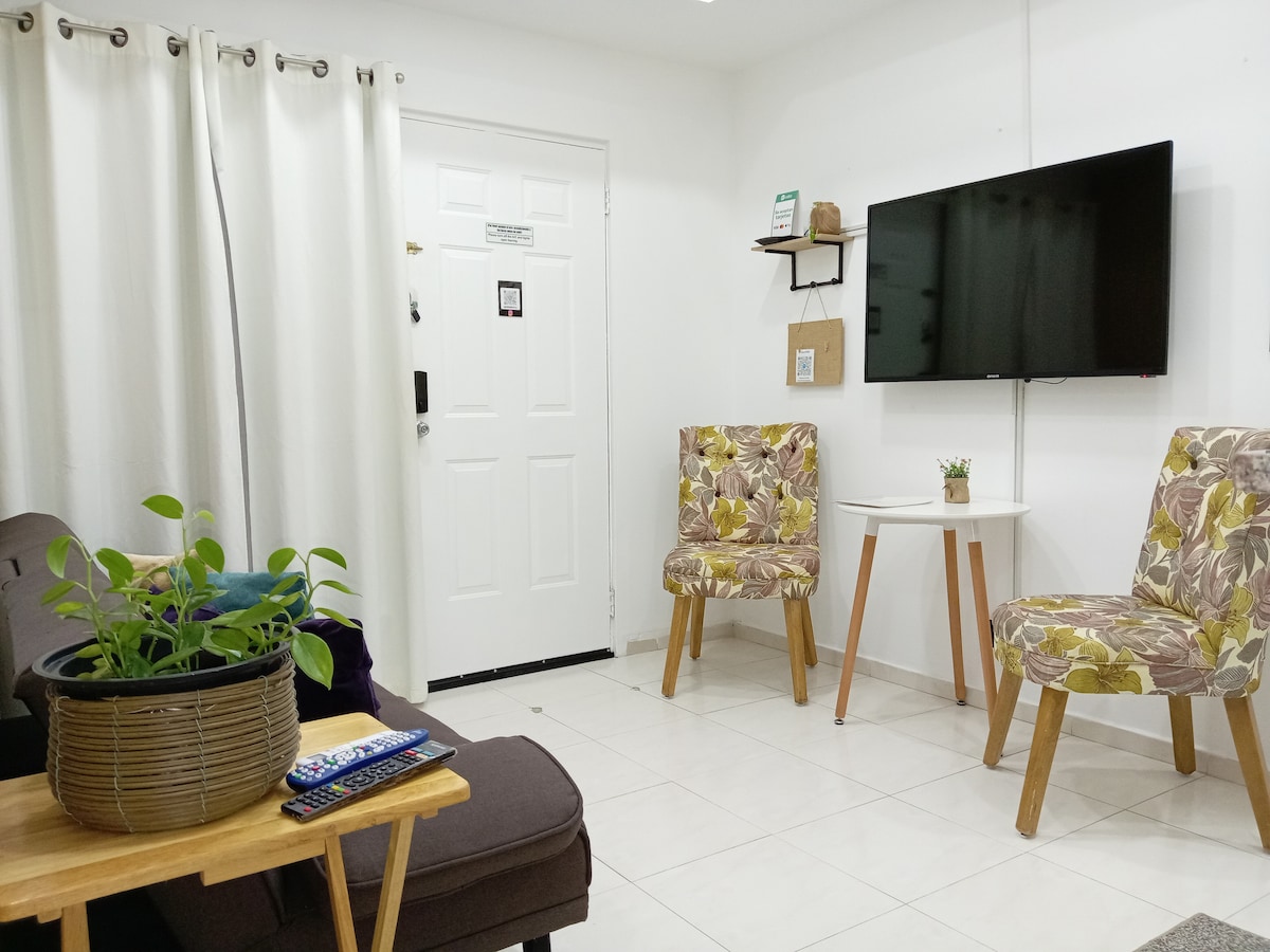 Enjoy a modern, private studio (30m²) for up to 3 adults (1 queen bed and 1 sofa bed), just 7 km from Tocumen International Airport. Perfect for layovers, business trips, or relaxing before your next destination. Stay in a gated community with optional private parking. Conveniently located near shopping centers, restaurants, Don Bosco Metro Station, and Corredor Sur — only 20 minutes from the vibrant energy of Panama City. Transportation services are available upon request for a fee.