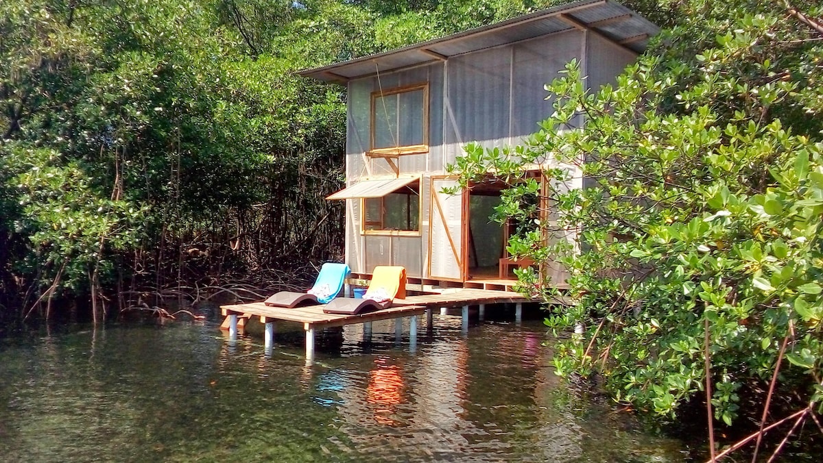 This secluded loft-style treehouse sits on stilts above the water, 30 feet from our colorful coral reef. Transparent and airy but bug proof walls let you enjoy the fresh ocean breeze and views while keeping you safe and cozy. When a sloth comes to visit, no need to leave the house to see him! Blend in with the surroundings of mangrove, lagoon and jungle, and enjoy water and reef access from your own deck. Bright and airy, 100% eco-conscious.