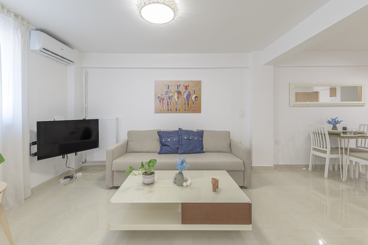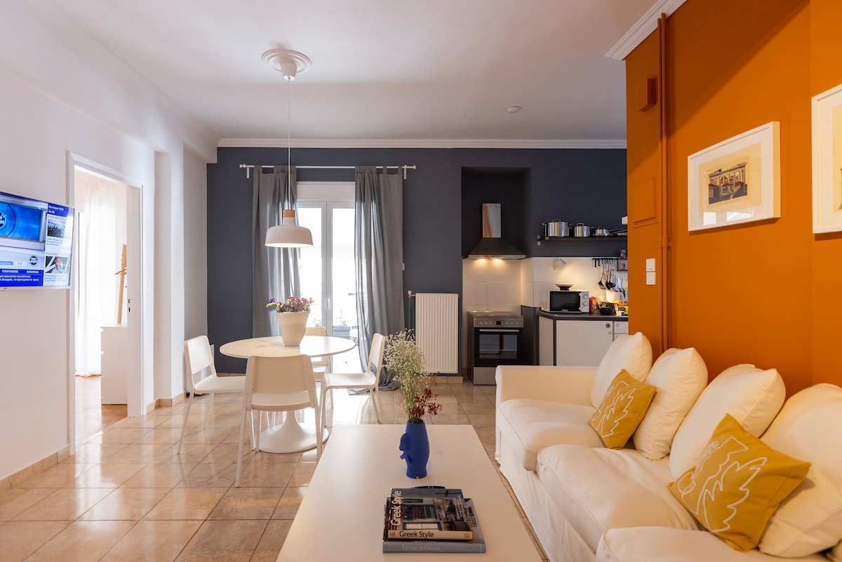 Experience Athens in unparalleled luxury from a spacious apartment, where every room is a window to history! Marvel at the Acropolis from an expansive living area, featuring dual sofa lounges, dining spaces, and a balcony that invites the cityscape. Perfect for professionals, a vast workspace boasts high-speed internet and inspiring panoramic views. Indulge in a modern kitchen, 2 bathrooms, and a sunny bedroom with a queen bed. Embrace the blend of comfort and history in this Athenian retreat!