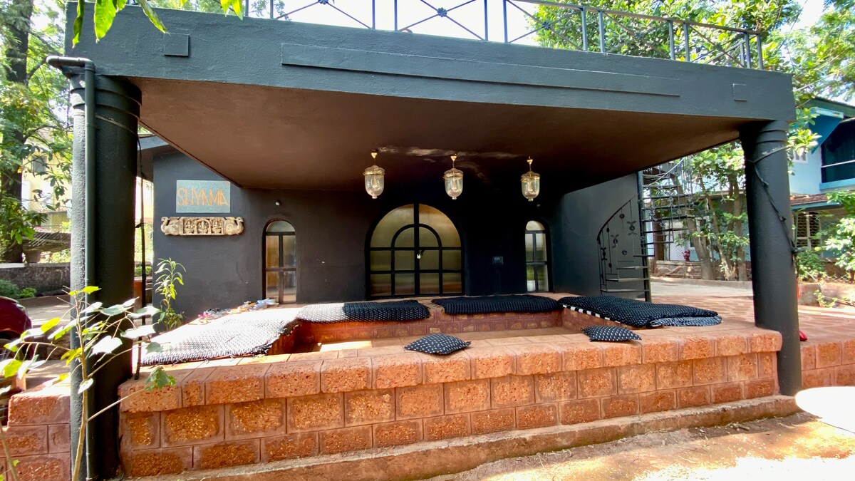 Welcome to Shyama Bungalow - our serene & stunning Bali-style getaway. With blush lime-wash walls, hanging cane chairs, spacious velvet couch, open kitchen, and lush plants. It is the perfect place for a big group of friends or family, or a company or curated retreat. Centrally located in Bhilar, just a 5 mins from Panchgani, 15 min to Mahabaleshwar. Surrounded by trees, greenery, chirping birds, fresh cool air, blue sky and multiple large terraces to lie + watch the stars.