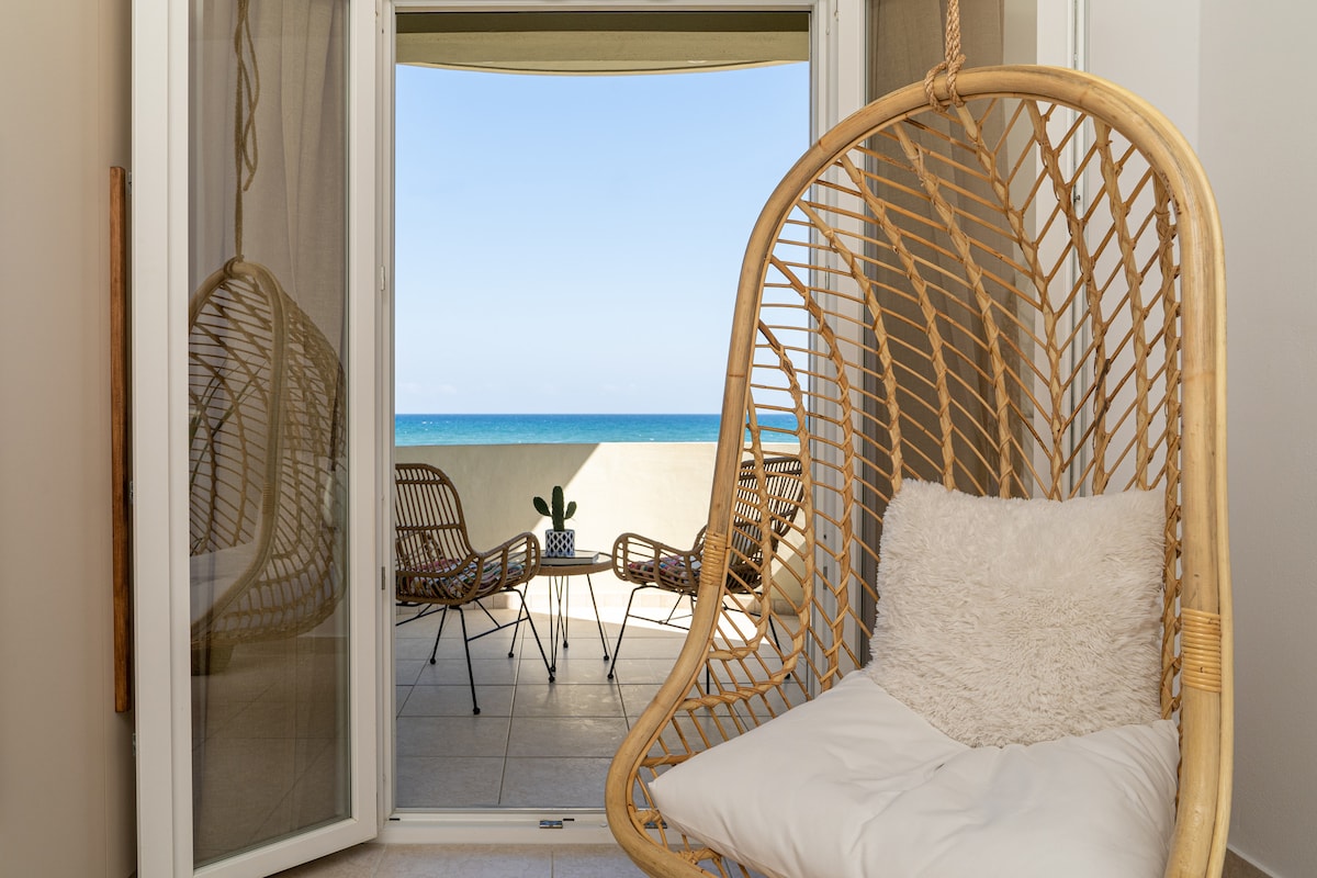 Experience comfort and tranquility in this newly designed apartment with a blend of white tones and boho accents. It features a fully equipped kitchen, open-plan living area with a sofa bed that converts into a double bed, and a spacious bedroom with a large double bed. Located on the first floor with elevator access, offers easy mobility. The expansive balcony overlooks the beach, providing sea views and the calming sound of the waves, along with a bamboo swing chair for ultimate relaxation.