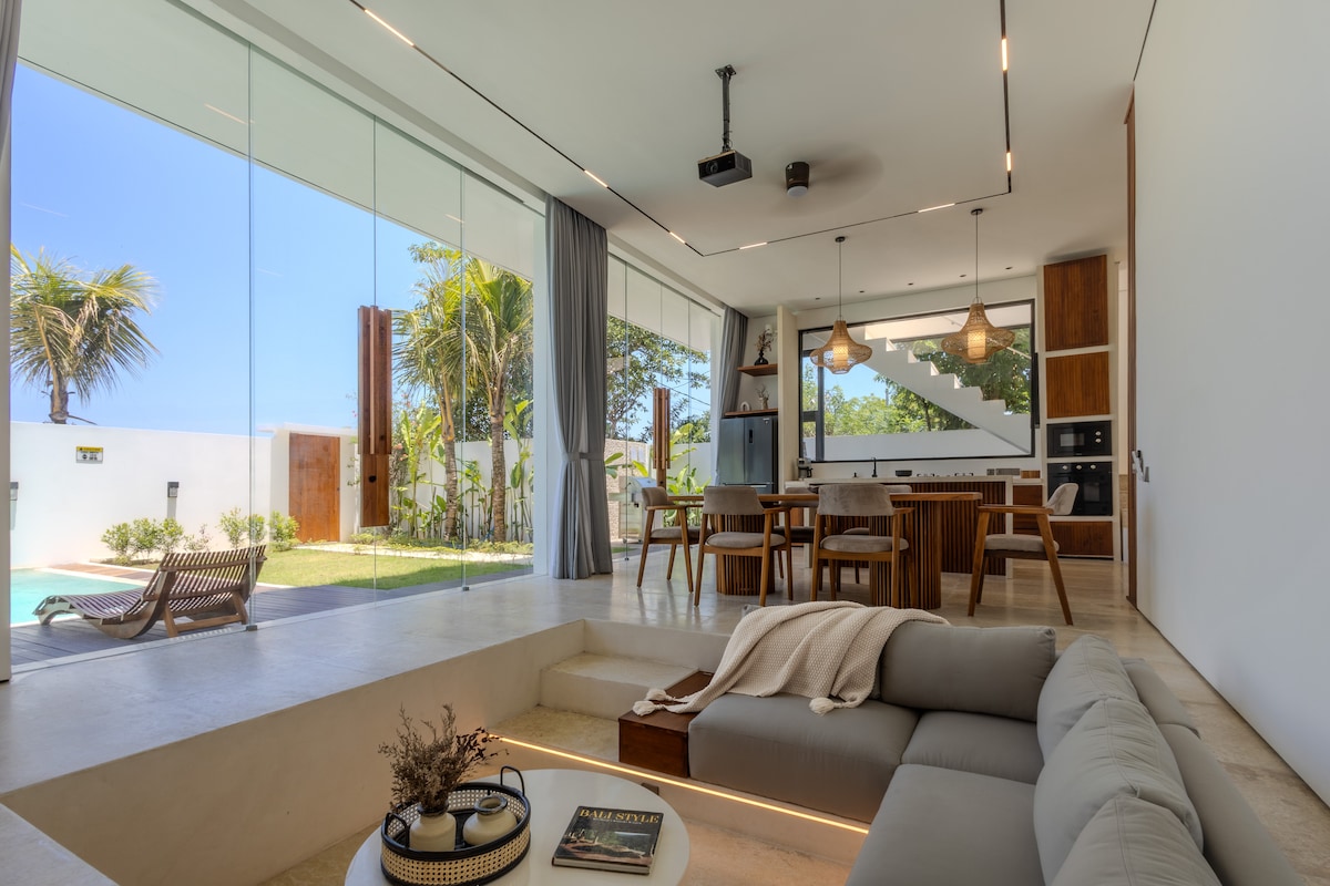 Brand New Villa in South Kuta: • 3 stylish air-conditioned bedrooms with garden views • 2 modern bathrooms with premium amenities (master-suite with a bathtub) • Huge pool, lush garden & patio for BBQs & lounging • Open-plan living with floor-to-ceiling glass doors • Fully equipped kitchen • 300 Mbps Wi-Fi • Daily cleaning, fresh towels & linens • Baby cot & high chair on request • Concierge service: airport transfers, tours & more • Netflix,PS5 on request