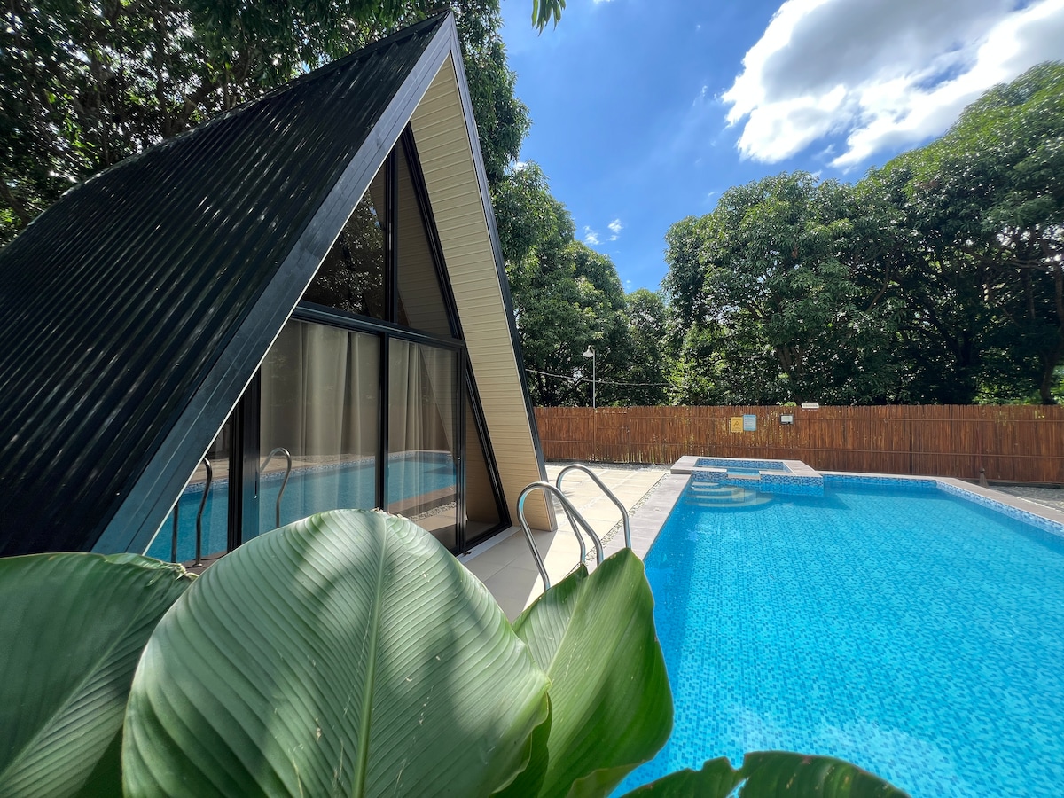 Step into an A-Frame home, where white tropical design meets ultimate comfort. From its sleek interiors to its sun-drenched outdoor oasis, every detail is meticulously crafted for a luxurious stay. With its clever layout, this A-frame home maximizes space without compromising on style or functionality, whether you are lounging by the pool, swinging on rattan swing, or enjoying the open plan living and dining area. The REDWOOD CABIN offers a tranquil escape in the heart of Bolinao.