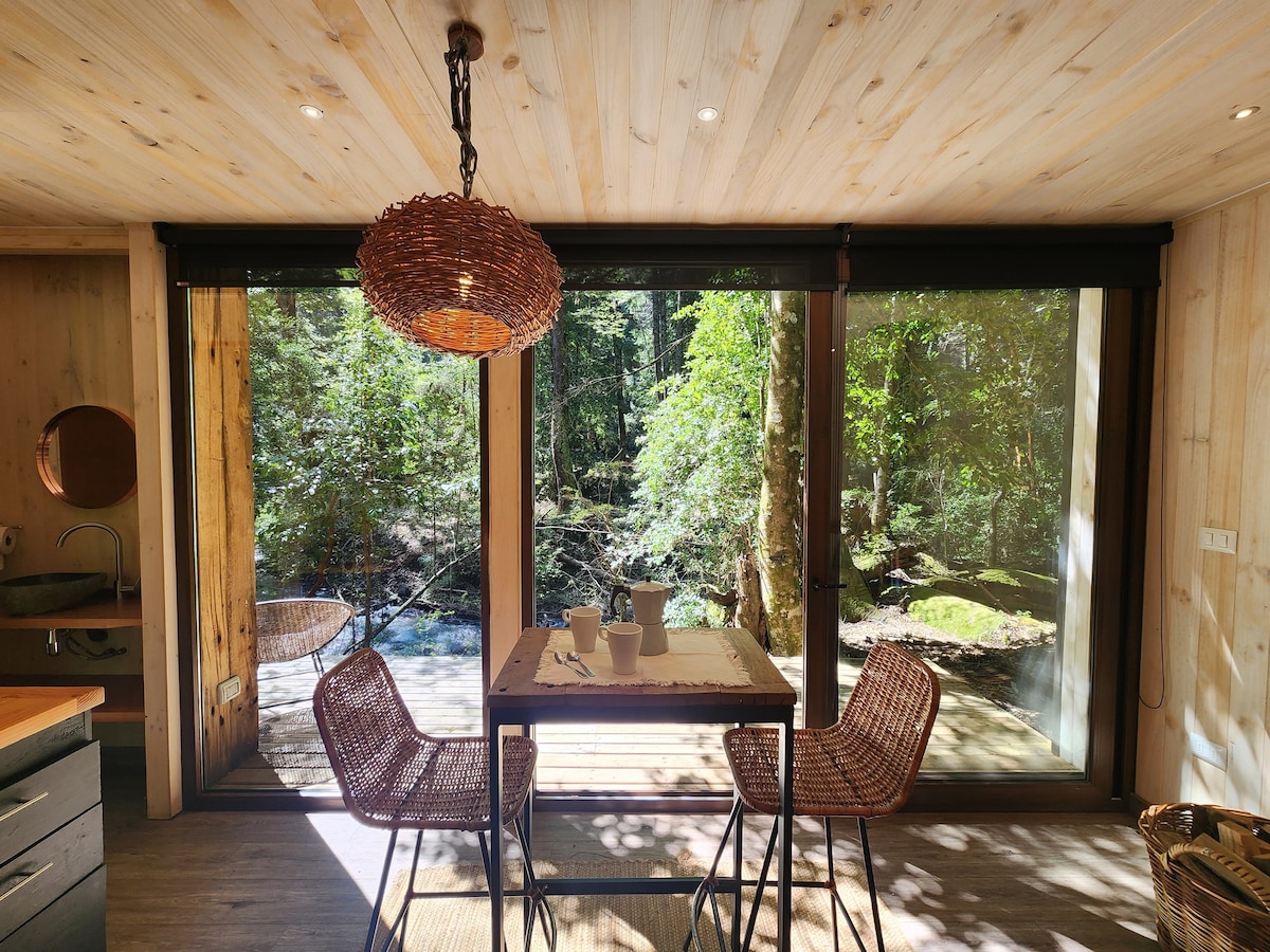 Our cozy recently built tiny home has amazing views of the pucon valley and is located only 7 mins by car or four miles from the city center. The last quater mile to the house is a gravel road with two steep hills and is only for 4x4 or awd cars. The tiny home is located near the famous waterfall "Salto del Claro" and is not more than a few minutes from the "Rio Turbio" which is great for hiking or in summertime taking a deep in the volcanic spring waters.