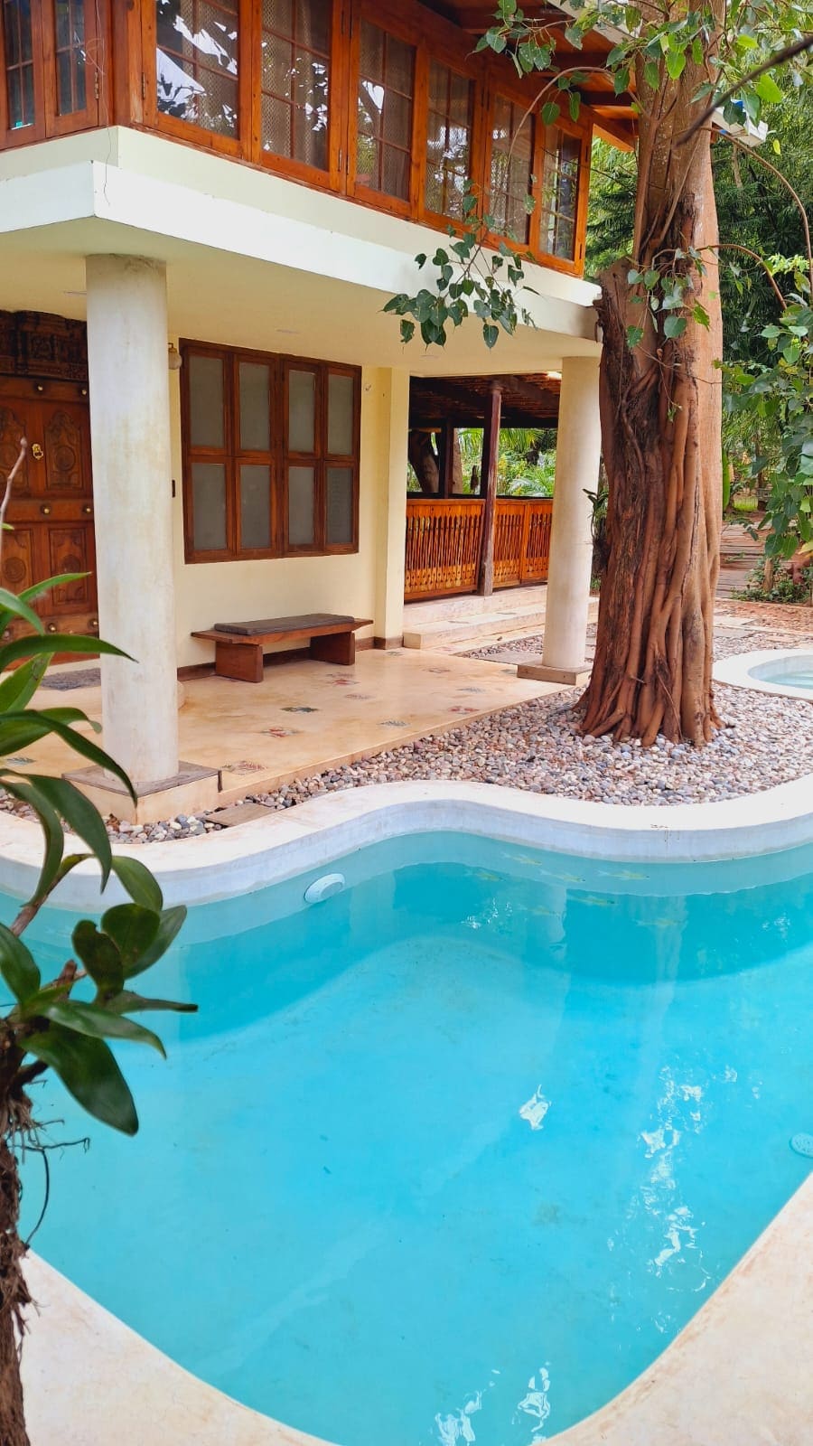 It’s a peaceful place to unwind for the whole family, and to experience a sense of well being that comes from connecting to the luxuriant garden that is the unique setting of this home. It is within 15 minutes driving distance from Matri Mandir, Auroville, as well as from Sri Aurobindo Ashram, Pondicherry, making it an ideal choice for the spiritual traveler. While the home itself has an intimate feel, the lush garden is spread over three acres, embellished with shrines, ponds, and pathways.