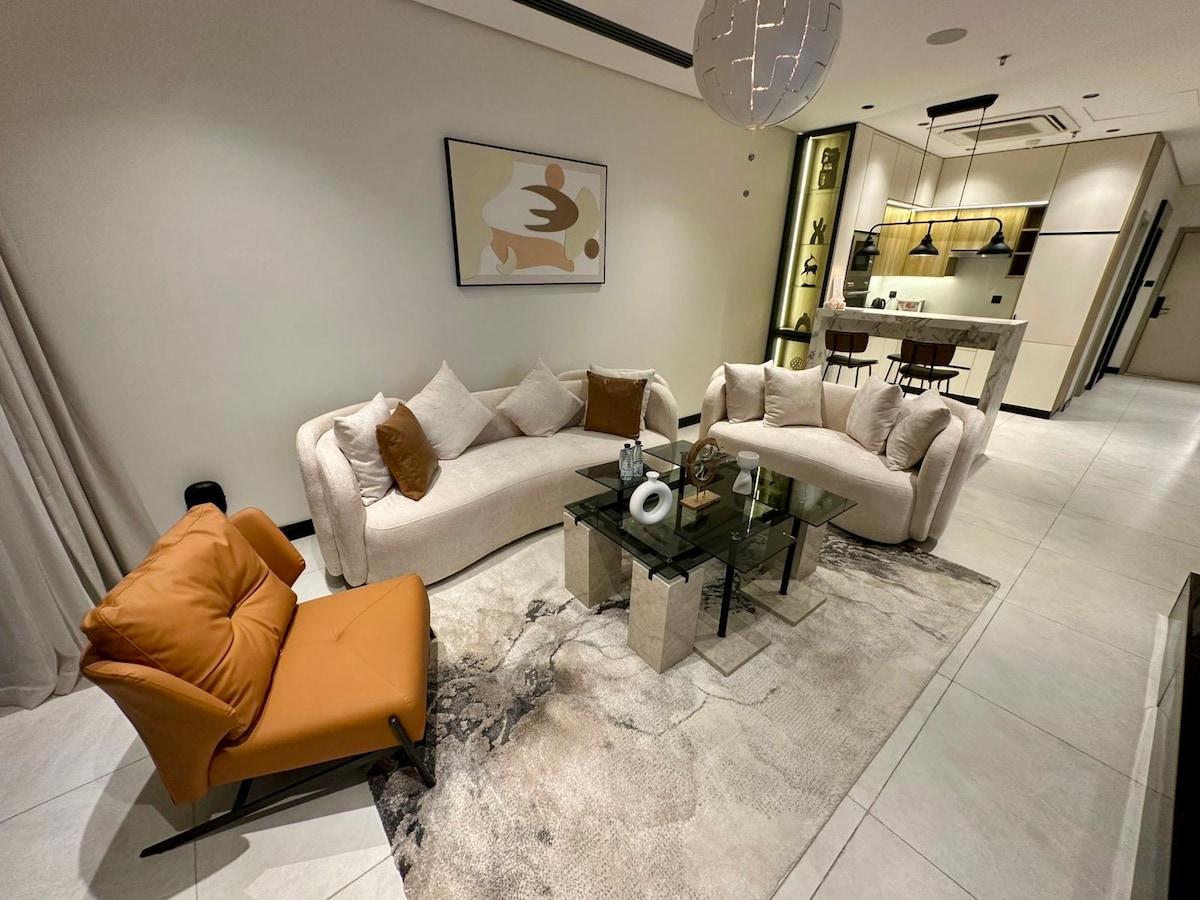 Enjoy a stylish experience at this centrally-located place.Luxurious 2-bedroom apartment in The Oval Tower on KF Road, just a 7-minute walk from Kingdom Tower. Features a stylish living room with guest bathroom, fully equipped kitchen, dining area, 2 en-suite bedrooms, balcony with panoramic city view, and access to a rooftop infinity pool. The tower opened in 2025. “Gym isn’t operating Yet”