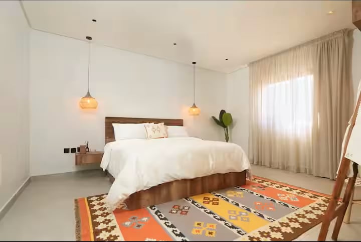 Modern 2BR apartment with a private rooftop in Al Muruj, North Riyadh. The rooftop features outdoor seating, a billiards table, and a relaxing hot tub, creating a perfect place to unwind. Inside you’ll find a stylish living area with an 85" QLED Smart TV, home theater sound system, and high-speed fiber WiFi. The apartment also includes a fully equipped kitchen with an oven, microwave, coffee machine, kettle, and a washing machine. Perfect for couples, friends, and relaxing rooftop evenings.