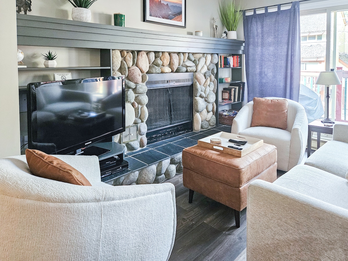 Fall in love with the Rocky Mountains in this creek side ski in ski out townhouse. Fully renovated, this beautiful Riverbend Panorama home, with a view of the mountains, is located steps away from the gondola and hiking trails along the picturesque Toby Creek. There are two separate bedrooms, each with their own full on-suite bathrooms, and a fire side queen size sofa bed (with upgraded foam mattress) in the living room to accomodate a total of six guests.