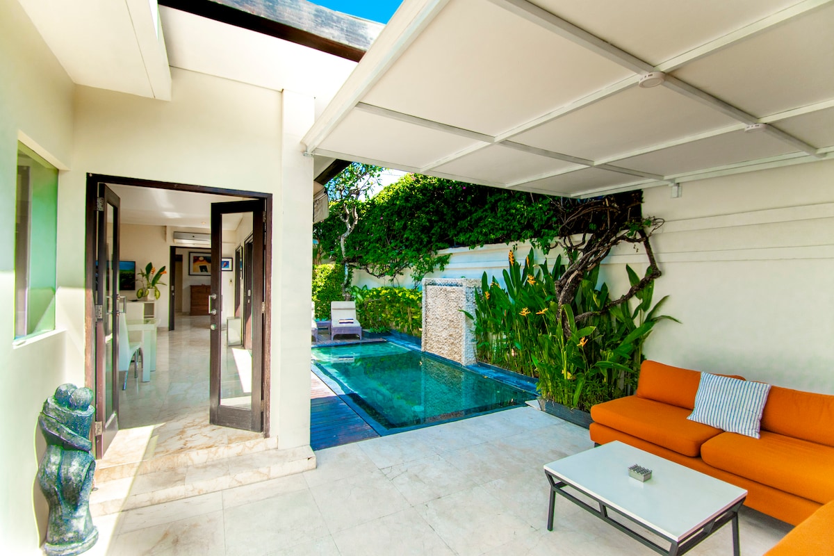 Escape to our Brand New 1 BR villa with private pool in superb location in the heart of Canggu, This is the perfect villa for couples or solo travelers who loves to explore famous spot in Canggu. Just 3-5 walk to great Restaurant, Shop, Gym, CoWorking, Pilates, cafes & Bars. It is just few minutes from famous beaches like Nelayan, Batu Bolong, Canggu Beach, This villa features a luxurious king bed, ensuite bathroom, kitchen, pool, living room, and open living spaces to relax by the private pool