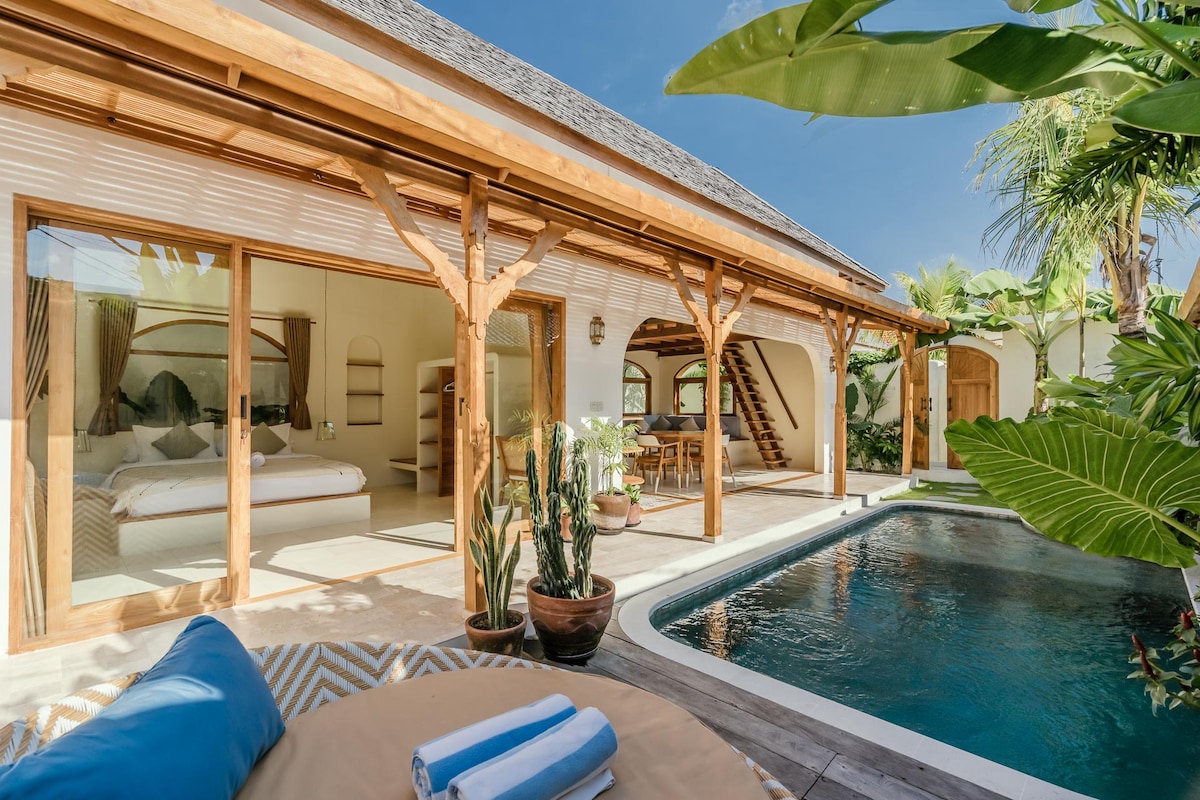 Villa Magnolia is a freshly renovated 2 bedroom modern villa with en-suite bathrooms located in the heart of Canggu, Bali. This tropical boho-chic style villa has a private pool with outdoor shower and a cozy rooftop lounge where you can enjoy the view while sipping your morning coffee. All the rooms and also the office are air-conditioned. Thanks to its strategic location, many restaurants are within walking distance and you can reach Echo Beach by a 4 minute ride to admire the sunset.