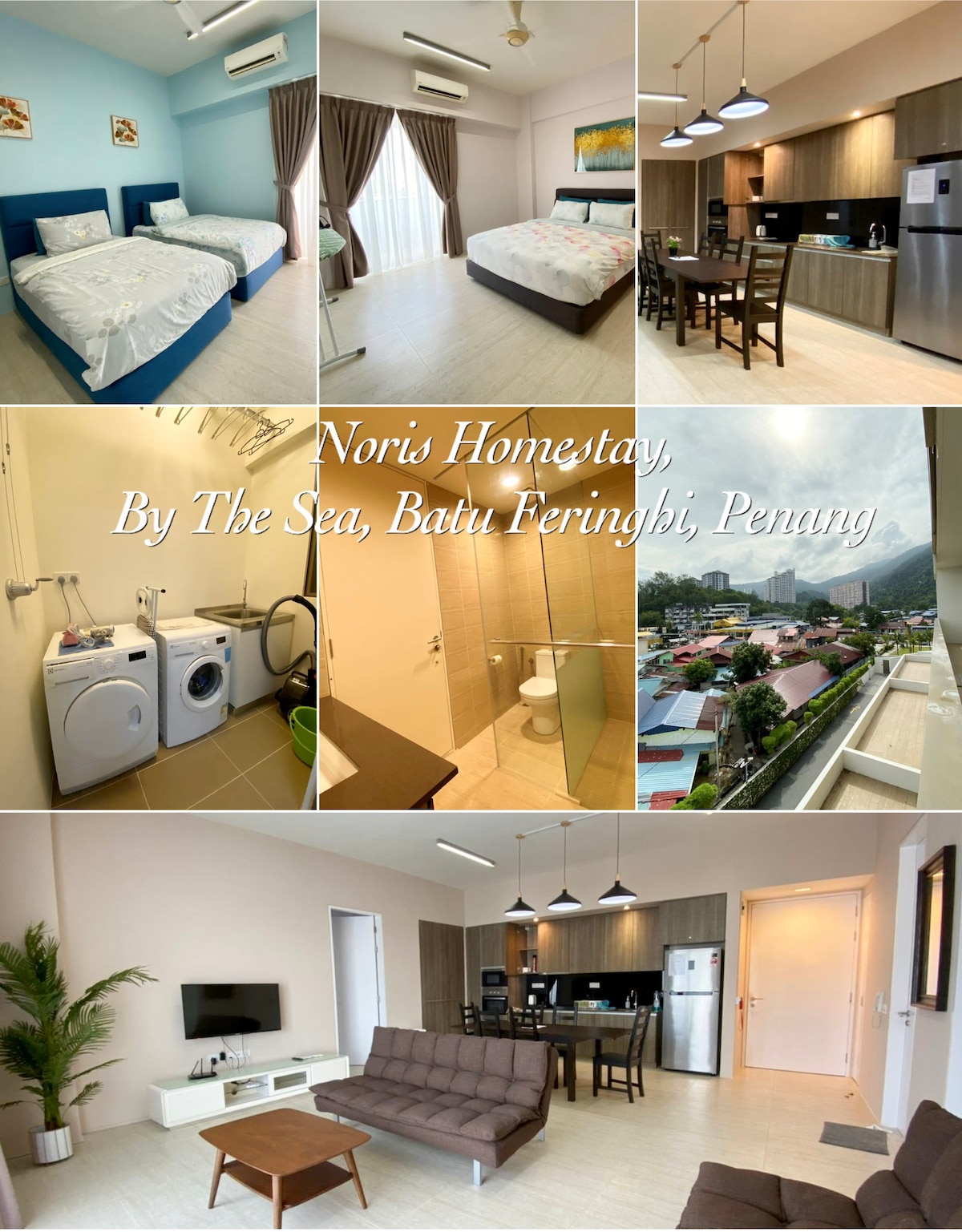 LEVEL 3 @ By The Sea, Batu Ferringhi, Penang Partial Sea View Fully air conditioned 2 bedrooms • 1 King bed in room 1 • 2 super single beds in room 2 2 bathrooms (water heater) 1 living room with 2 sofa beds Smart TV (No Netflix), WiFi, Washer, Dryer & Refrigerator Induction Cooker Kettle Oven & Microwave Towels provided 1 car park Infinity Pool, Playground & Gym 24H CCTV + Guarded + Gated Direct beach access (Feringhi Bay) Walking distance to Restaurants & Cafes 5.5km to Escape & Entopiau