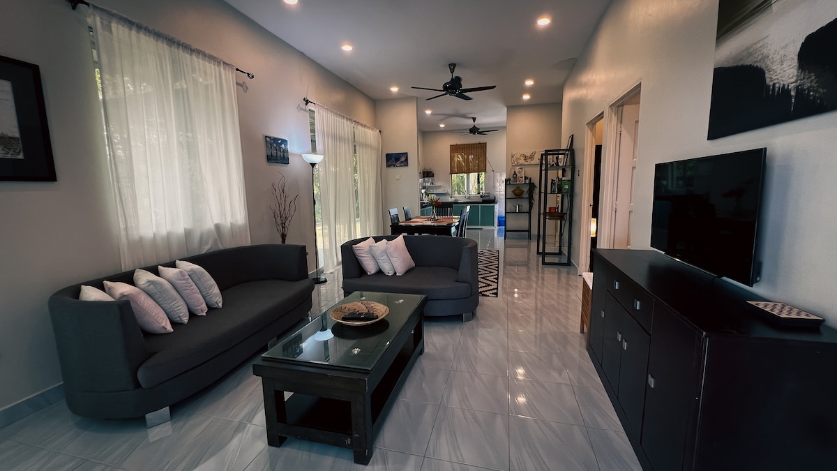 Welcome to our cozy industrial-style getaway nestled on Langkawi Island! This fully furnished 2-bedroom house is designed with a unique industrial flair, offering a stylish and comfortable retreat for your vacation. Enjoy high-speed wifi throughout the house, perfect for staying connected or streaming. Step outside to our charming outdoor garden, where you can relax amidst lush greenery and enjoy the island breeze. Chenang Beach just a 2-minute walk away, have easy access to sun, sand, and sea.