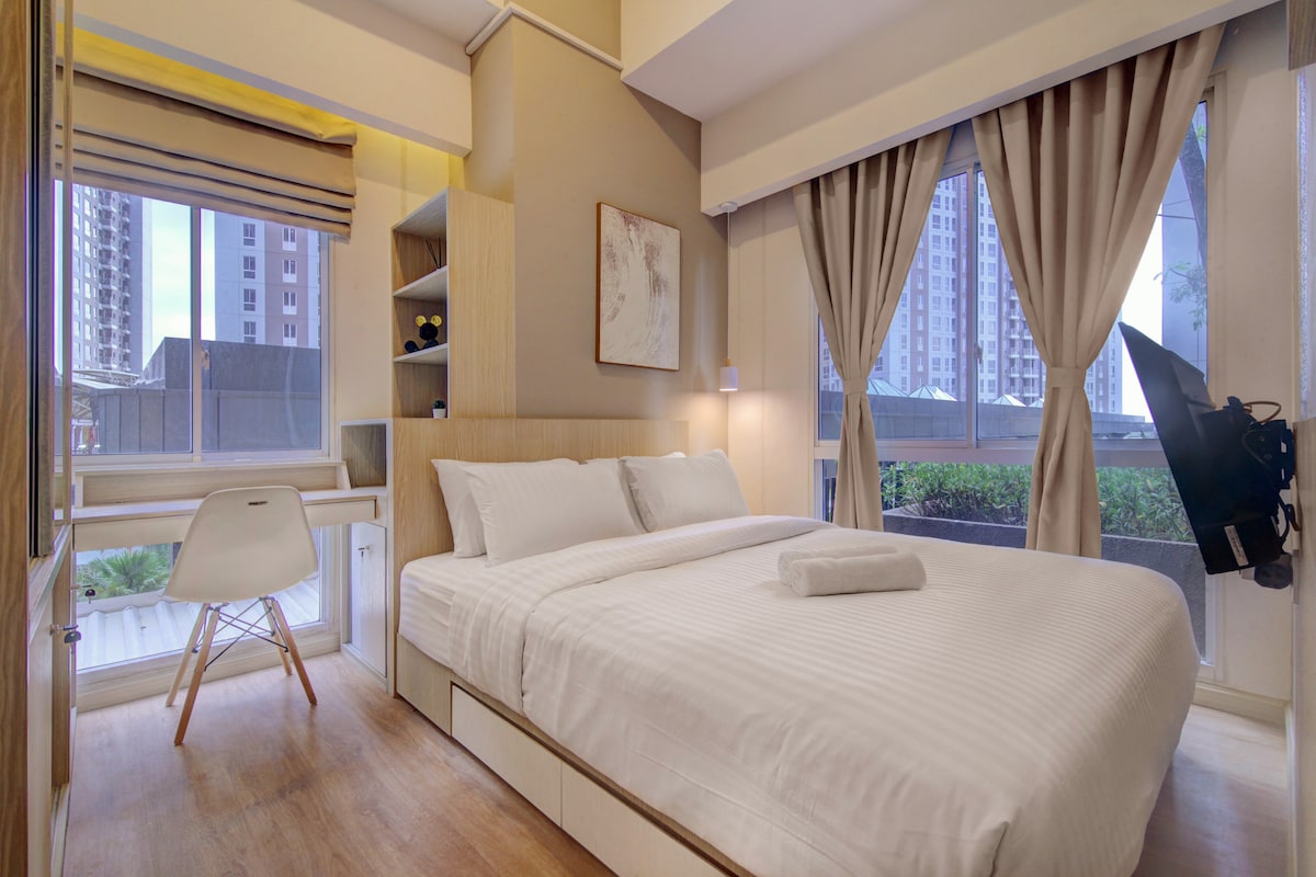 Stay in a stylish, compact and cozy 1-bedroom, apartment in the heart of Pantai Indah Kapuk (PIK), Jakarta. Perfect for work or leisure for 2 or 3 persons, this apartment offers everything you need for a cozy stay. Relax in the queen-size bed with soft linens or unwind on the sofa bed, ideal for extra guests. - The fully equipped kitchen includes a mini fridge, rice cooker, and cooking essentials, perfect for preparing simple meals. Included Wi-Fi, a smart TV, clean towels, and toiletries