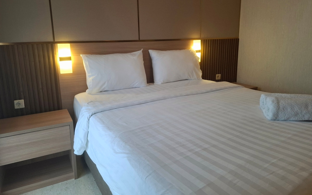 A spacious, cozy 1-bedroom apartment with a living room and balcony at Citralake Suites, West Jakarta's ideal lakeside getaway. Conveniently located just minutes from the Airport, PIK, Puri Indah and Sunset Avenue, it’s easy to explore the city. Step outside and you’re just a 1-min walk from Ciffest, a lively dining area with plenty of food options, supermarkets and ATMs. Our 1 BR unit provides a luxurious and comfortable space for up to 3 guests, with a kitchenette, Free Wi-Fi, and Netflix.