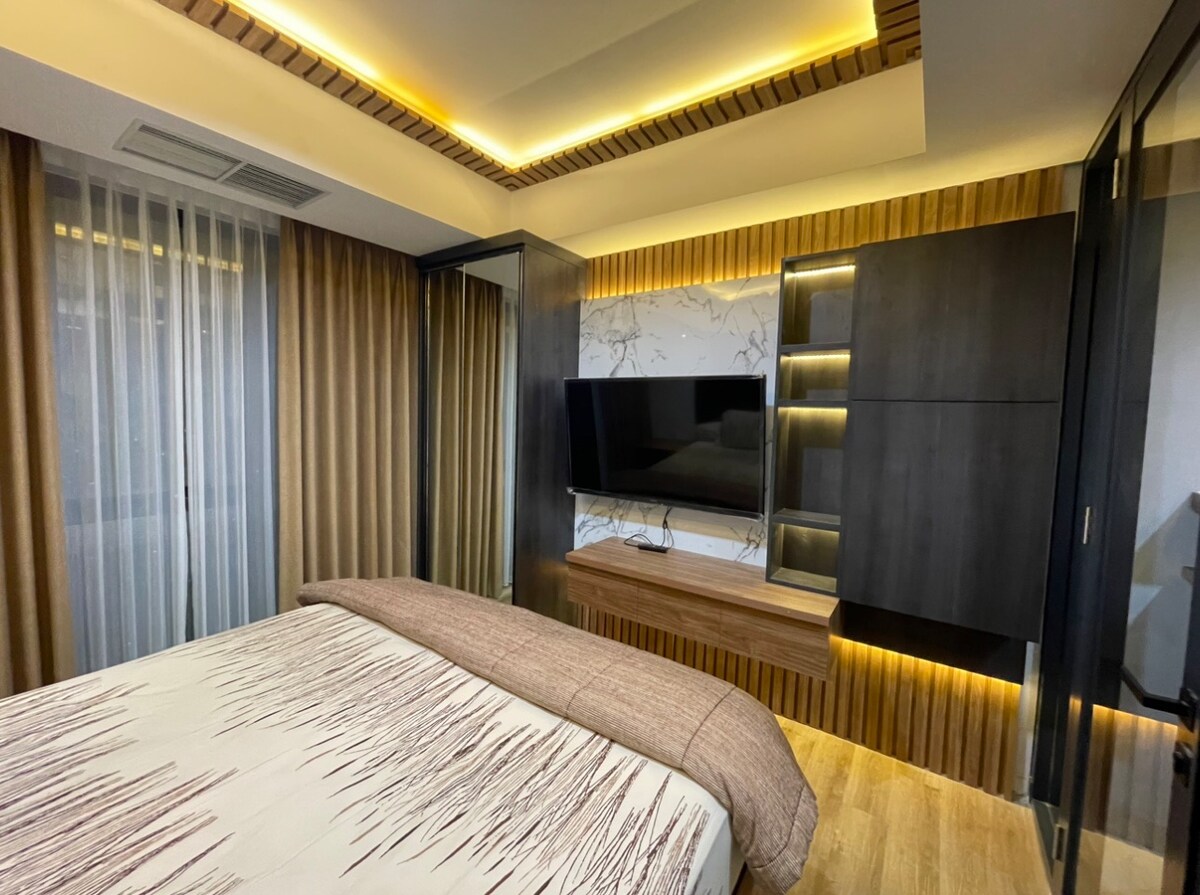 Stay in a stylish, compact and cozy 1-bedroom, apartment in the heart of Pantai Indah Kapuk (PIK), Jakarta. Perfect for work or leisure for 2 or 3 persons, this apartment offers everything you need for a cozy stay. Relax in the queen-size bed with soft linens or unwind on the sofa bed, ideal for extra guests. - The fully equipped kitchen includes a mini fridge, rice cooker, and cooking essentials, perfect for preparing simple meals. Included Wi-Fi, a smart TV, clean towels, and toiletries