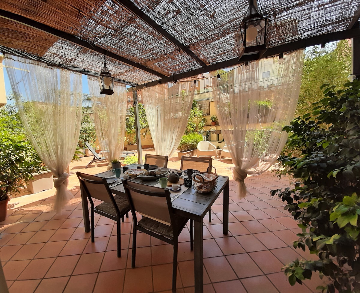 Nel centro storico di Roma, nel caratteristico quartiereTestaccio. Appartamento di recentissima ristrutturazione per 6 persone con wi-fi, aria condizionata, confortevoli materassi ortopedici. E' composto da due camere da letto con smart TV 32 pollici, ciascuna con bagno privato, soggiorno con smart TV 43 pollici, cucina attrezzata con piastre ad induzione, lavastoviglie, forno, bollitore, tostapane, macchina del caffè. Un grande terrazzo di 30 mq attrezzato con tavolo, sedie, ombrellone